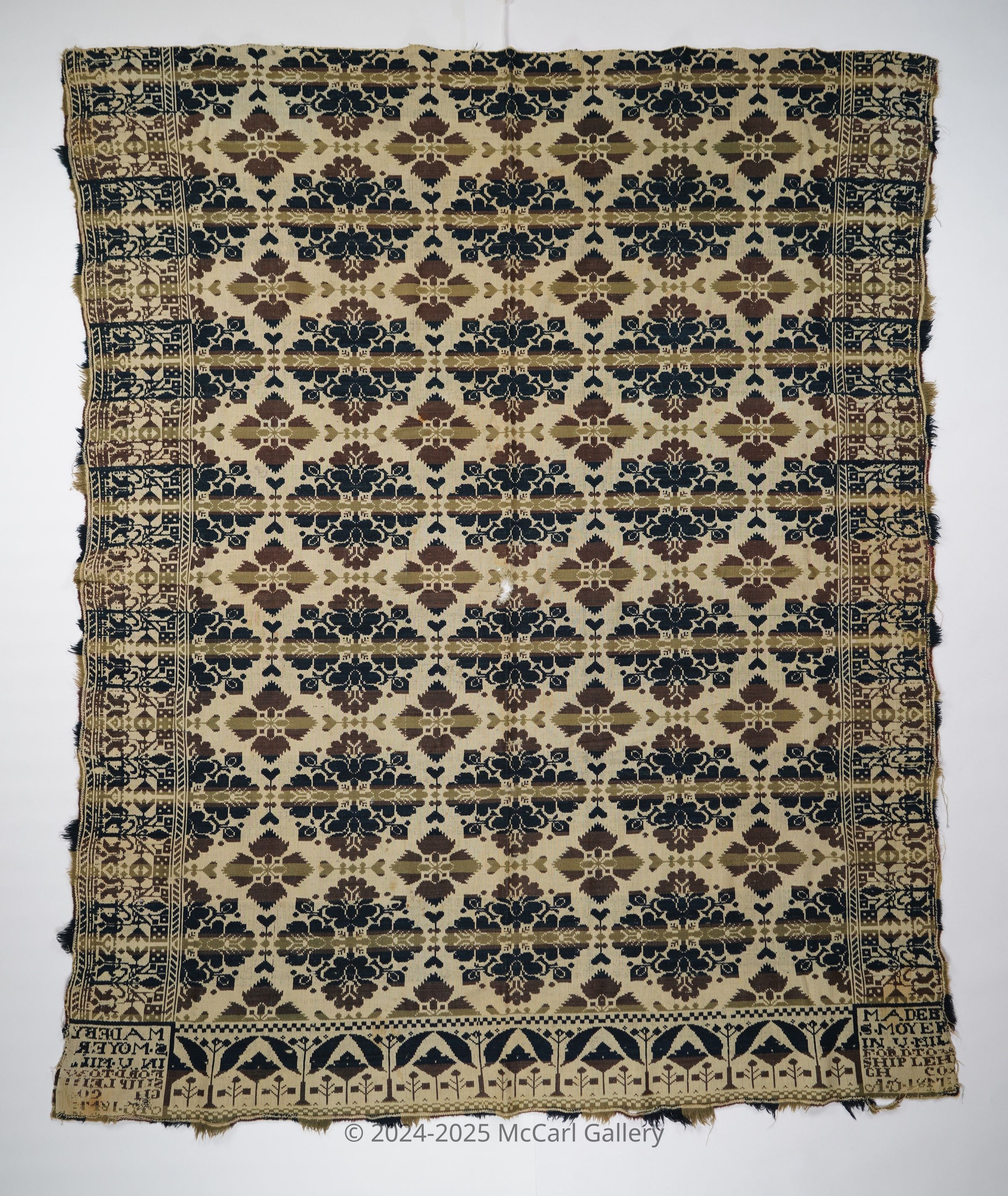Green, olive, navy, and natural figured tied half doublecloth coverlet with border on three sides. Two joined panels. Woven by S. Moyer in Upper Milford Twp., Lehigh Co., Pennsylvania in 1847.Collection
