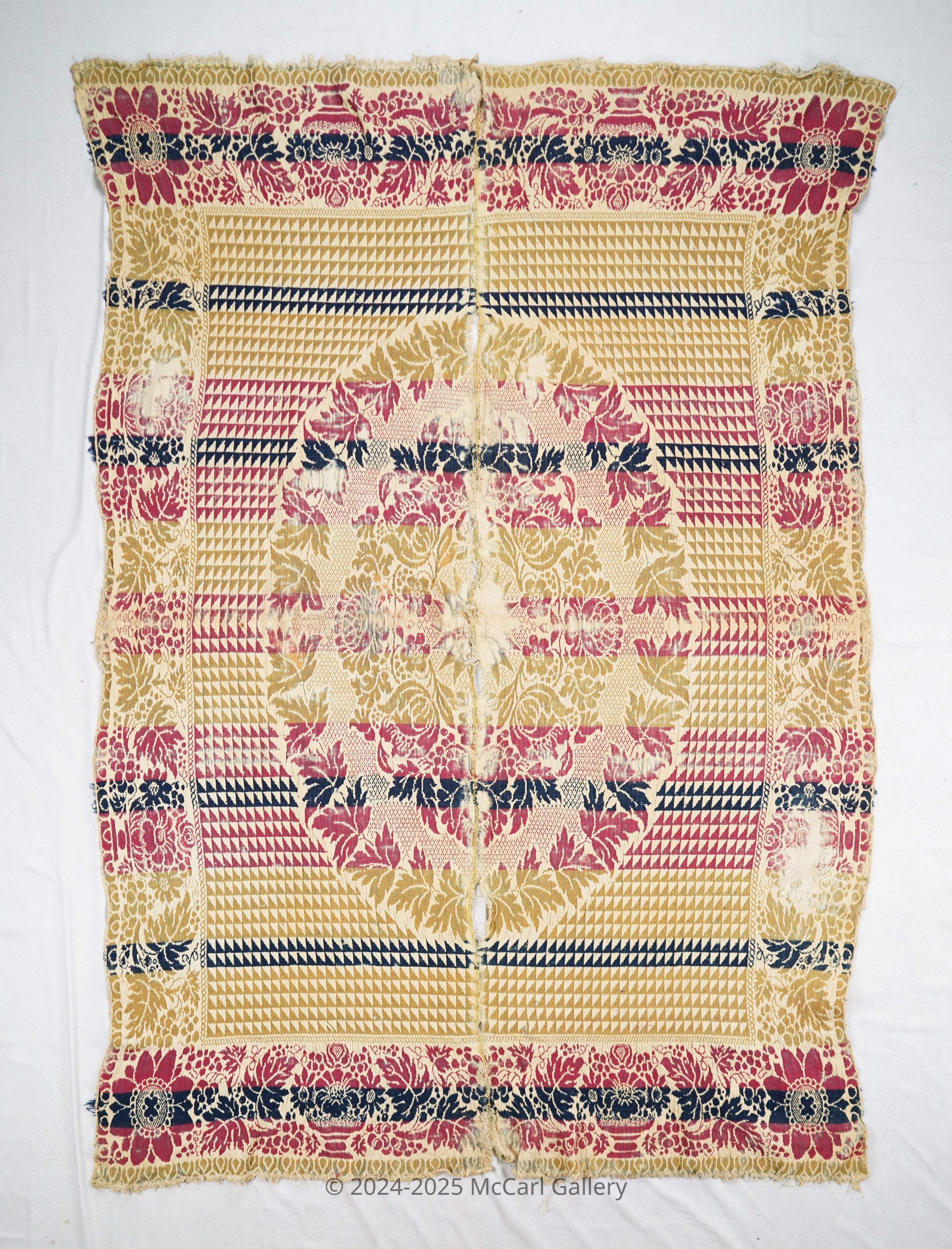 Natural, navy, yellow, and red figured true beiderwand coverlet; two panels joined by a center seam. Border on four sides; no fringe.