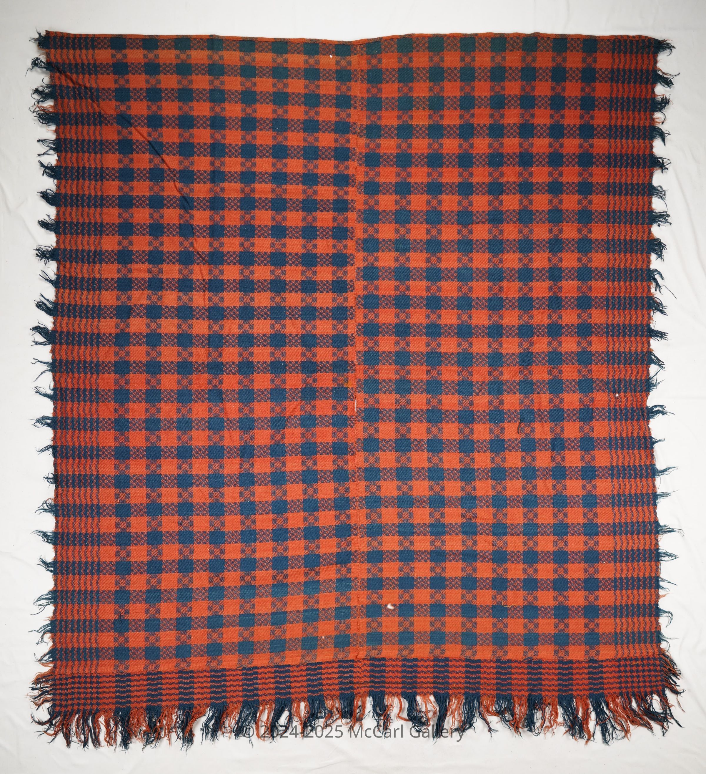 Red and navy geometric twill blocks coverlet; two panels joined by a center seam. Border and fringe on three sides.