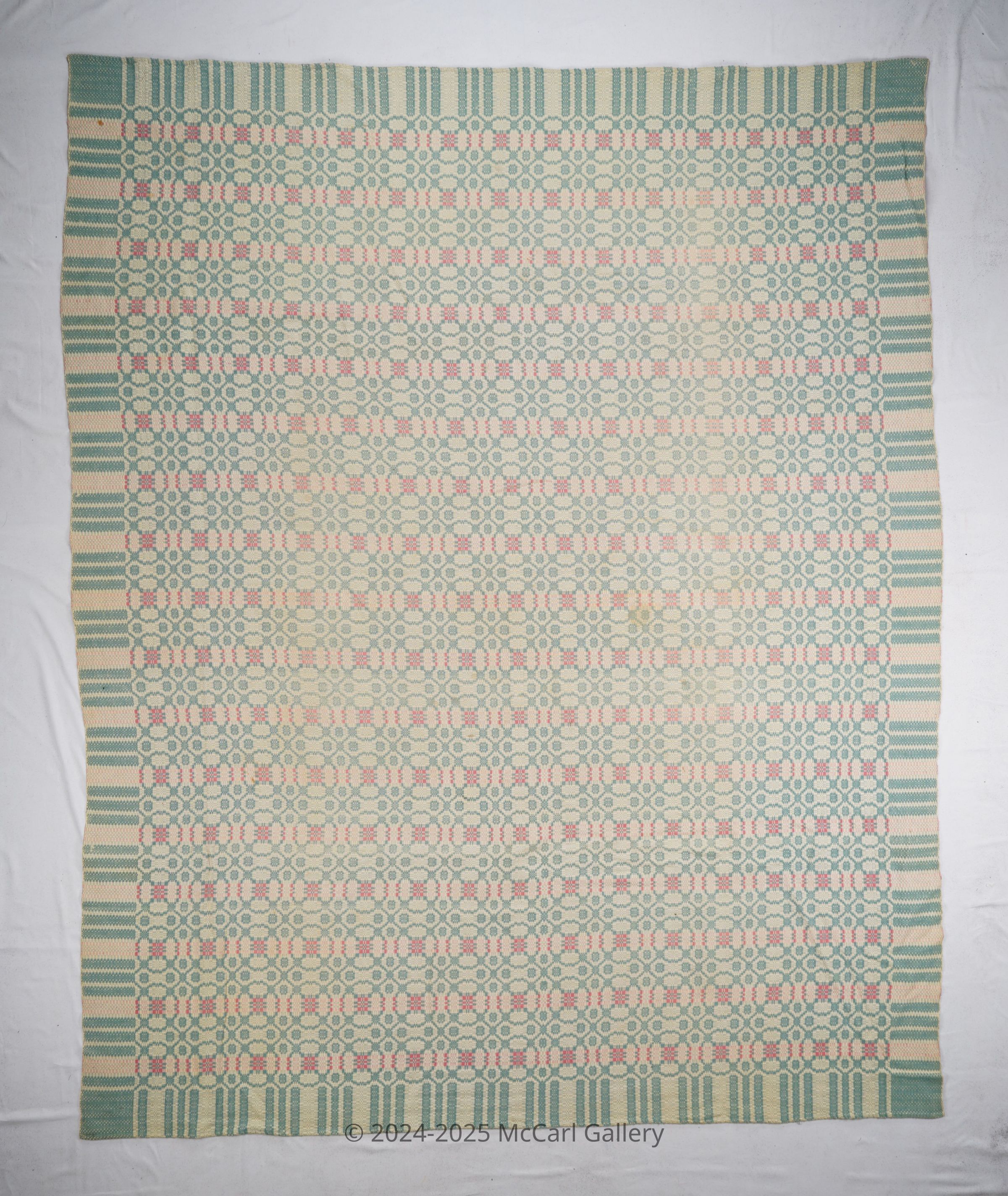 Reproduction pink, green, and natural geometric overshot coverlet; seamless. No fringe; border on four sides.