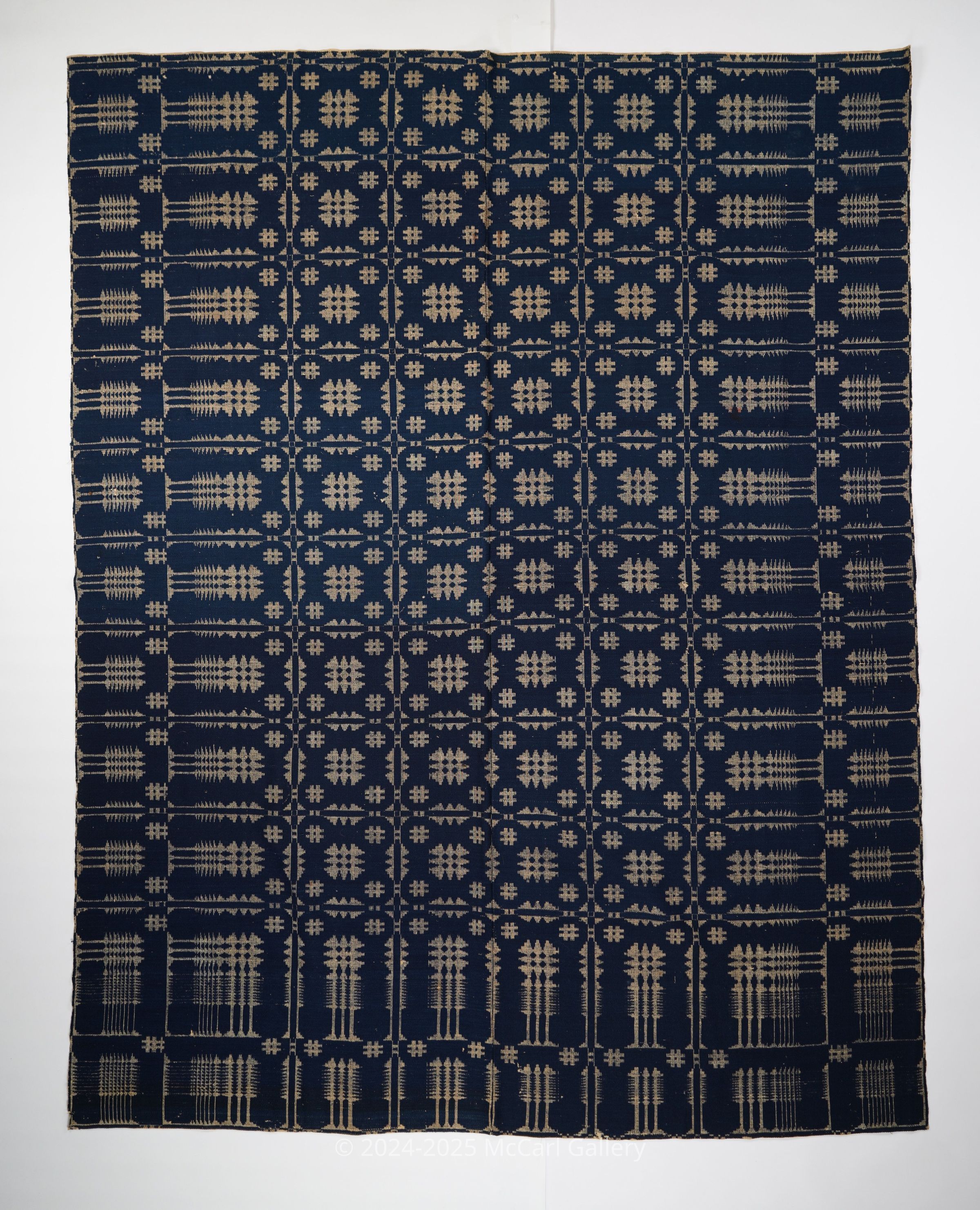 Navy and natural geometric summer and winter coverlet with border on three sides.Two joined panels.