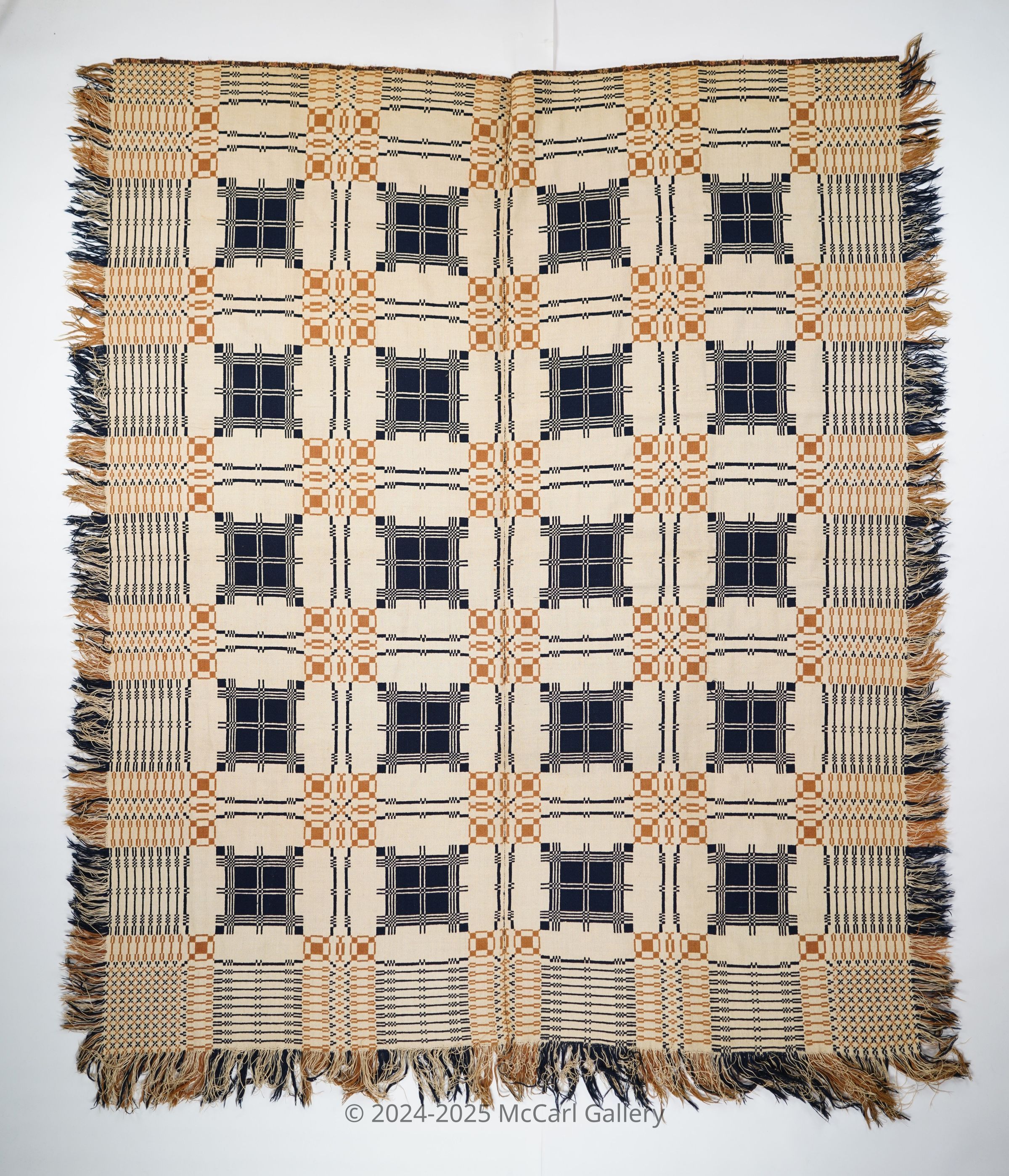 Orange, navy, and natural geometric double weave coverlet with border on four sides and self-fringe on three sides.Collection