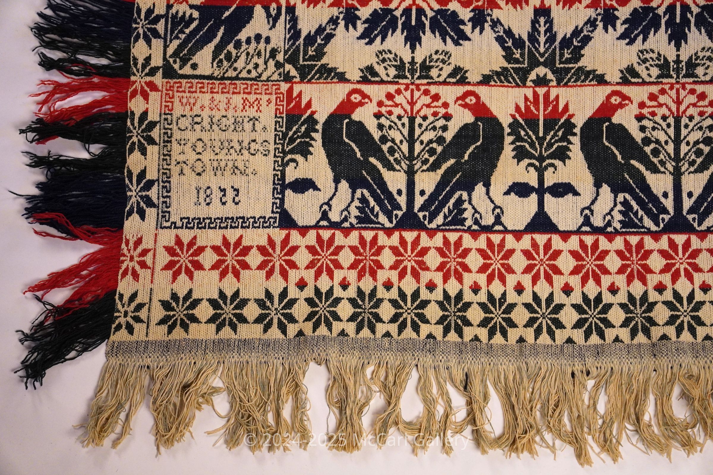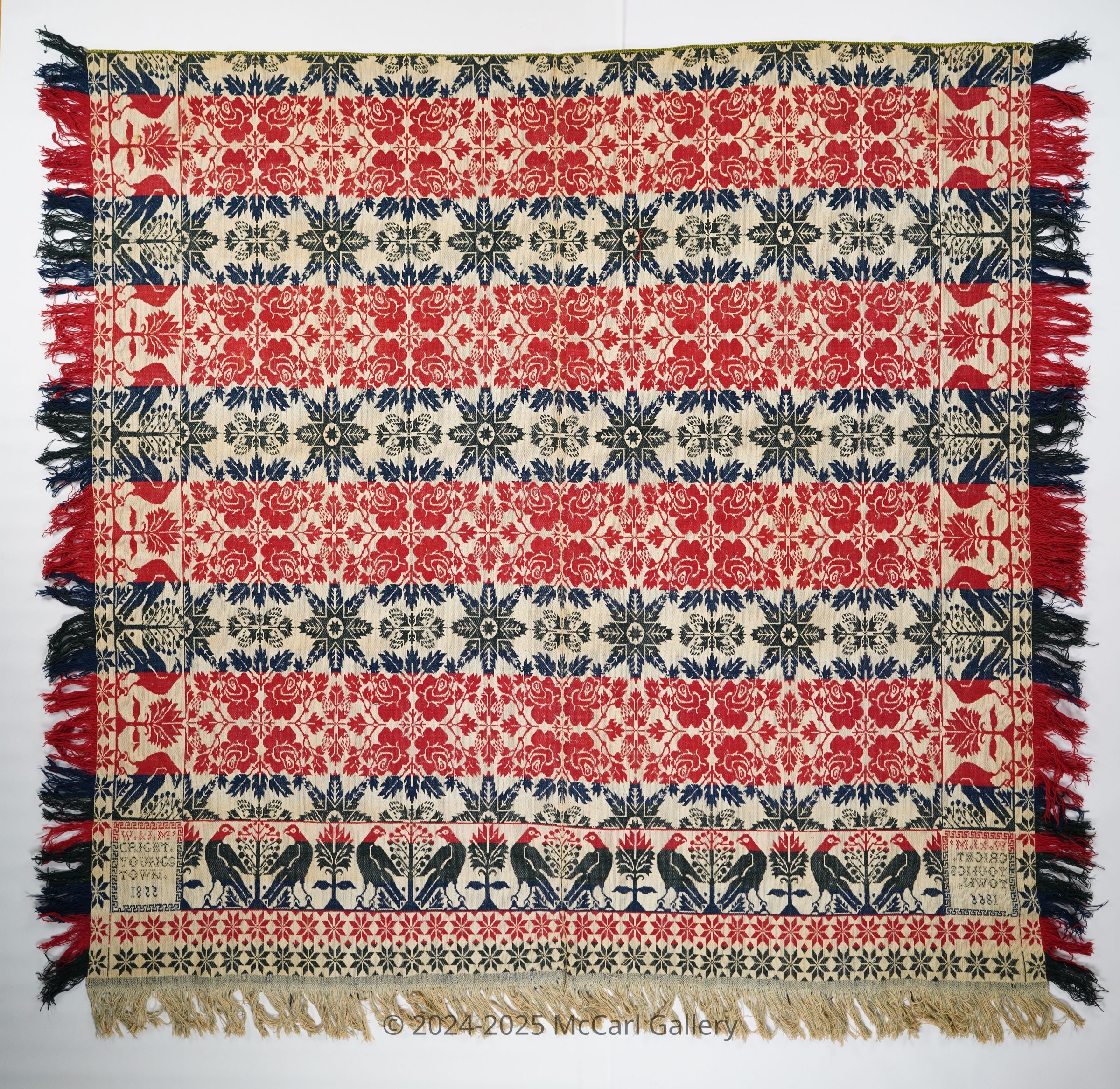 Navy, red, green and natural figured tied beiderwand coverlet with self-fringe and distelfink/star border on three sides. Woven by W. & J.M. Cright in Youngstown, Mahoning County, Ohio in 1855Collection