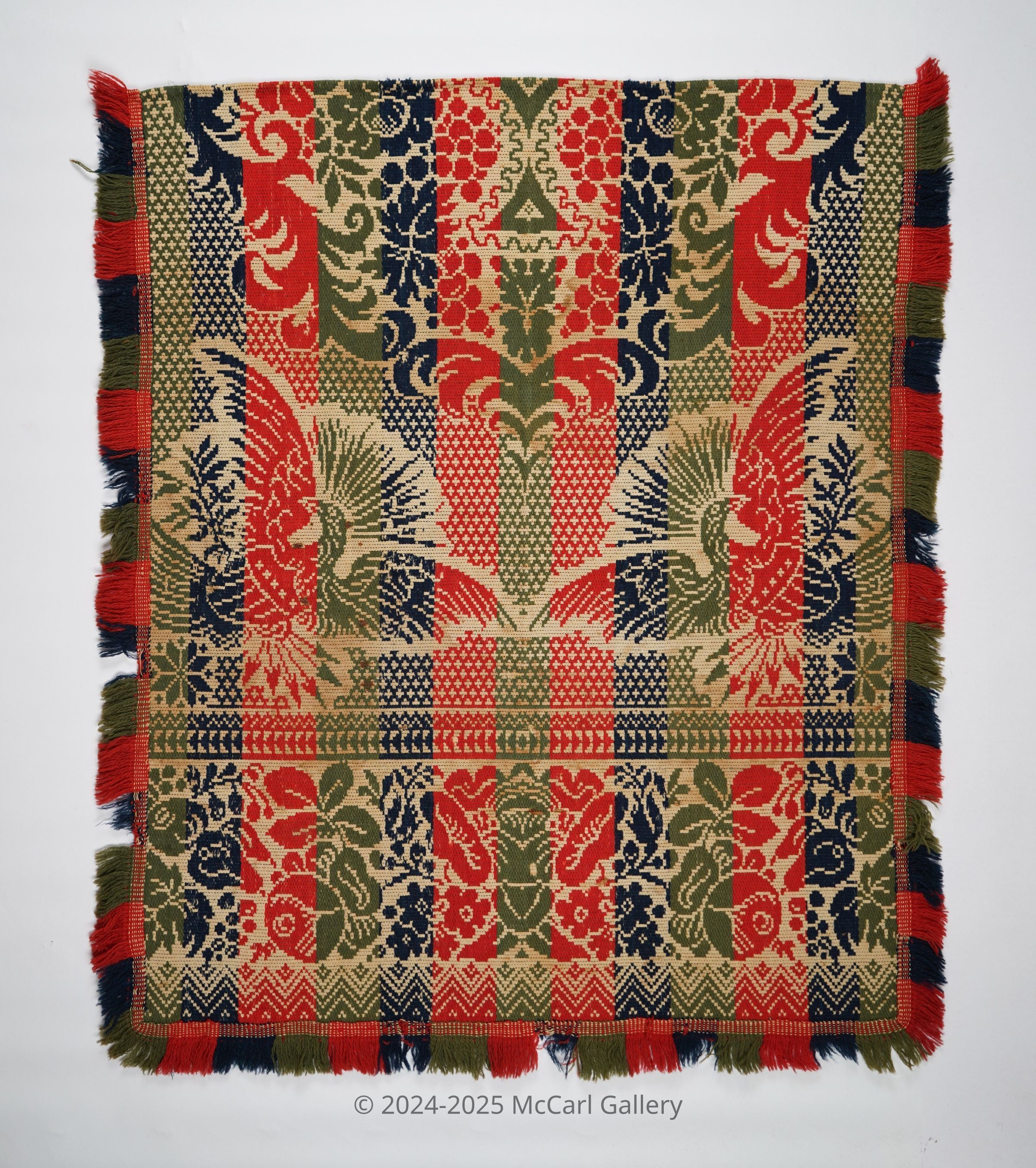 Red, green, navy, and natural figured tied half doublecloth crib coverlet with border along bottom and applied fringe on three sides.Collection