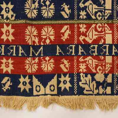 Red, navy, green, and natural figured tied half doublecloth coverlet with border and self-fringe on three sides. Two joined panels. Woven for Barbara Markey by John Wildin in York Co., Pennsylvania in 1838.Collection