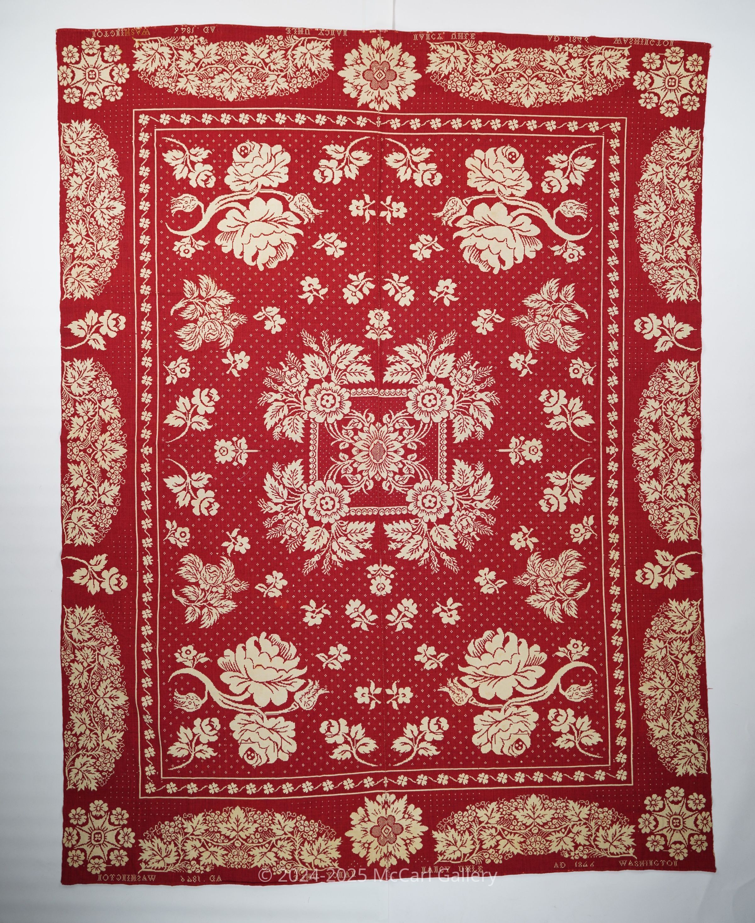 Red and natural figured double weave coverlet with center medallion pattern. Two joined panels. Woven for Nancy Uhle in 1846.Collection