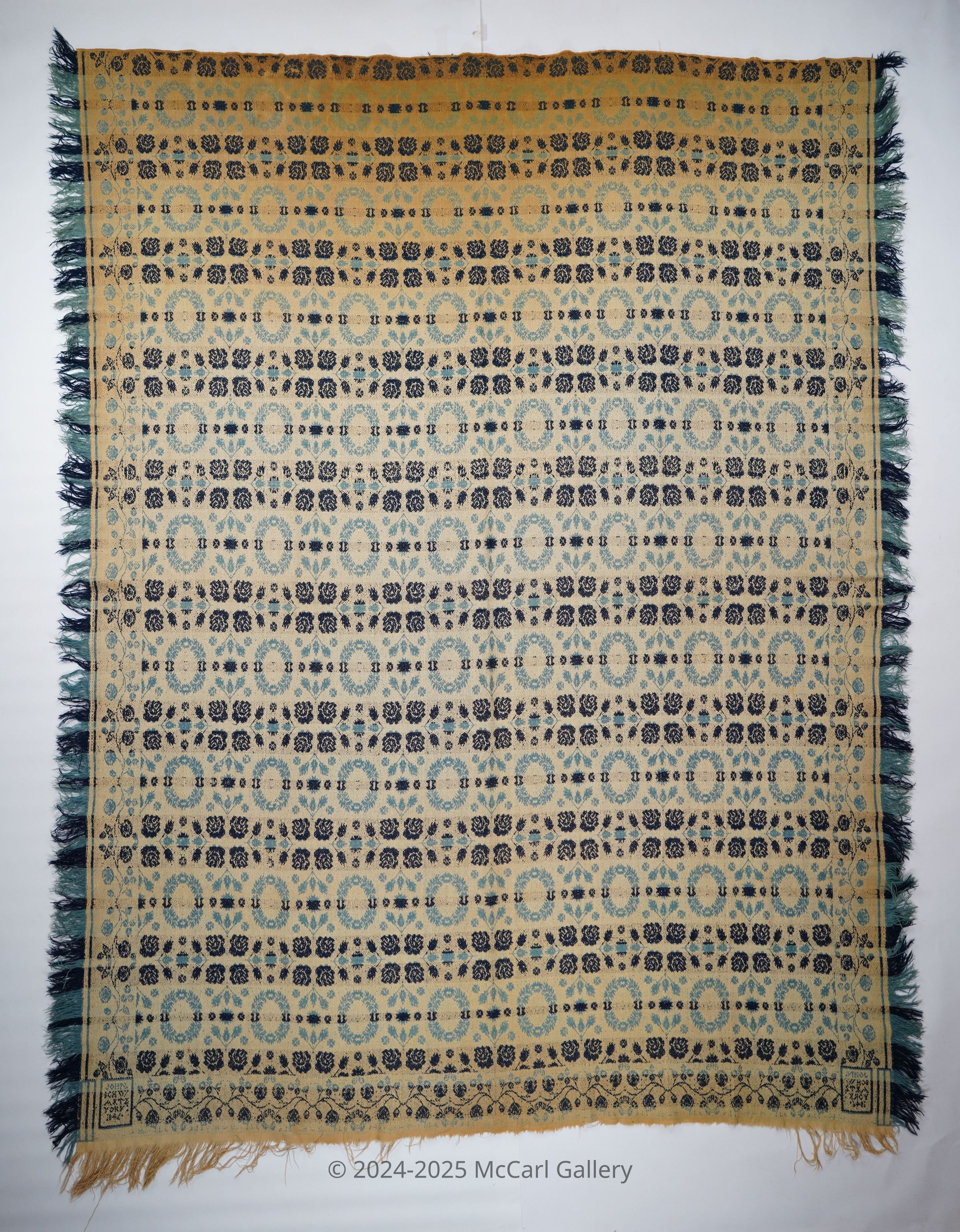 Blue, navy, and natural figured damask coverlet with border and self-fringe on three sides. Seamless. Woven by John Schwartz in York, York Co., Pennsylvania in 1846.Collection