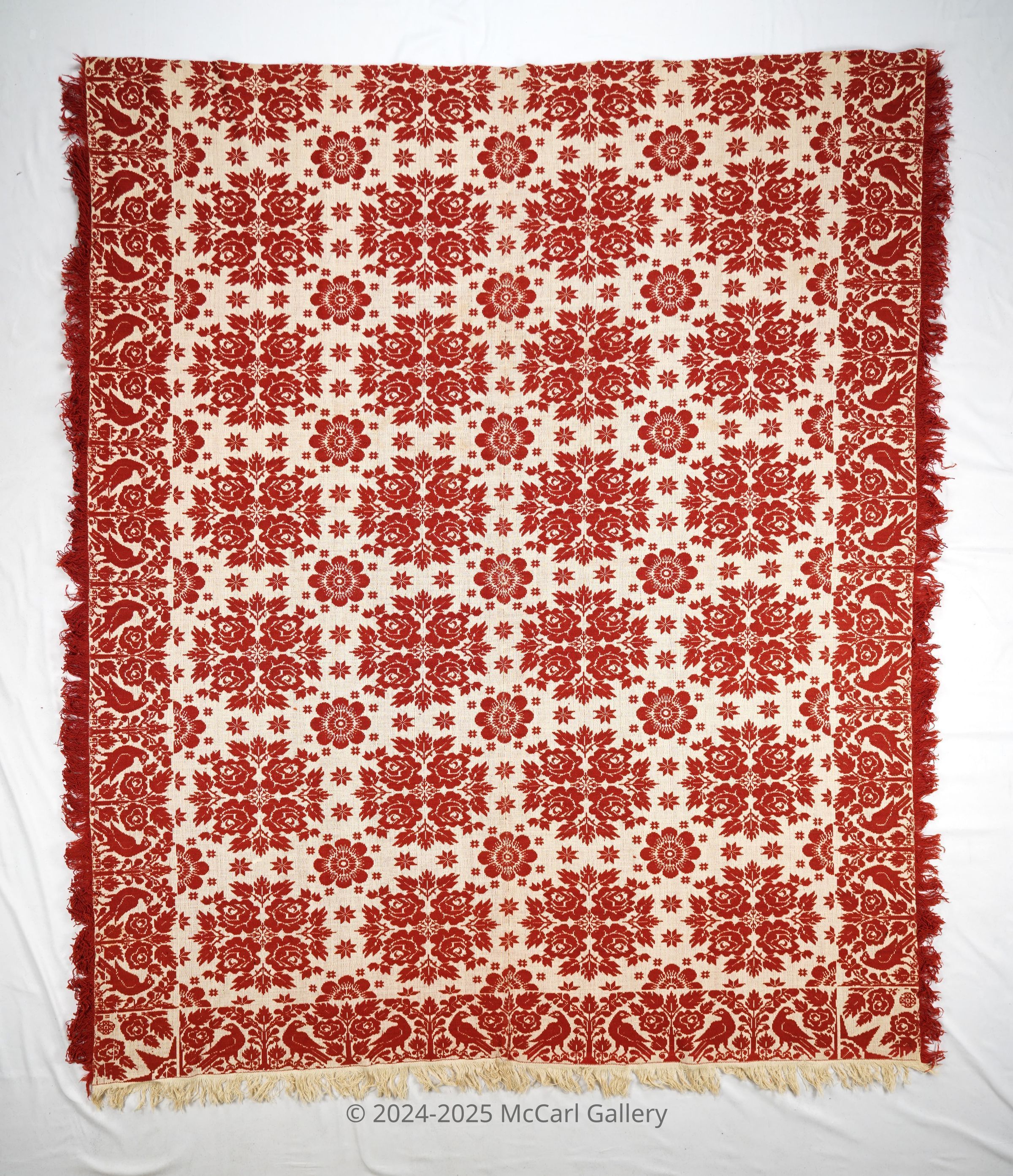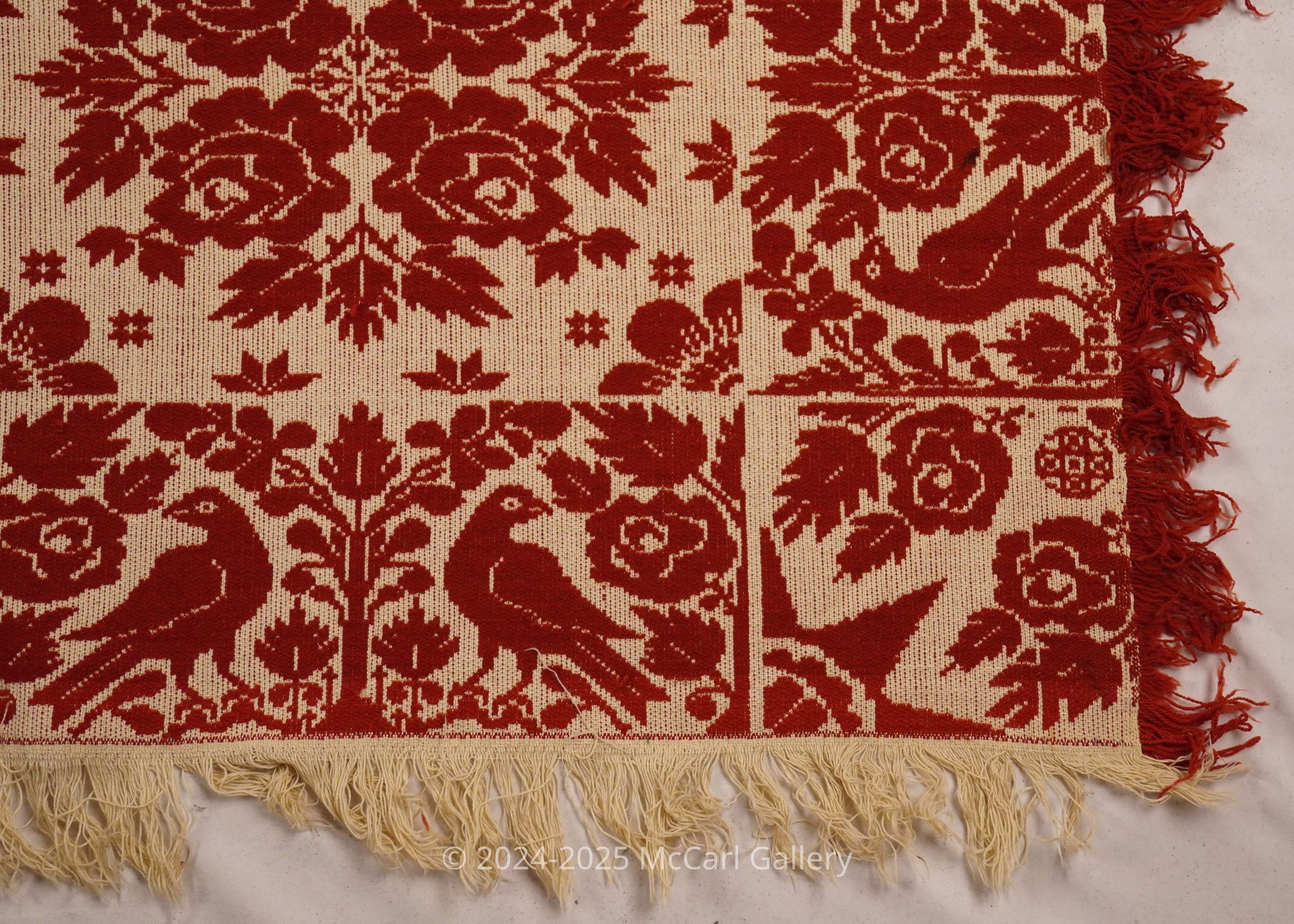 Natural and red figured tied beiderwand 2:1 coverlet; seamless. Border and fringe on three sides.