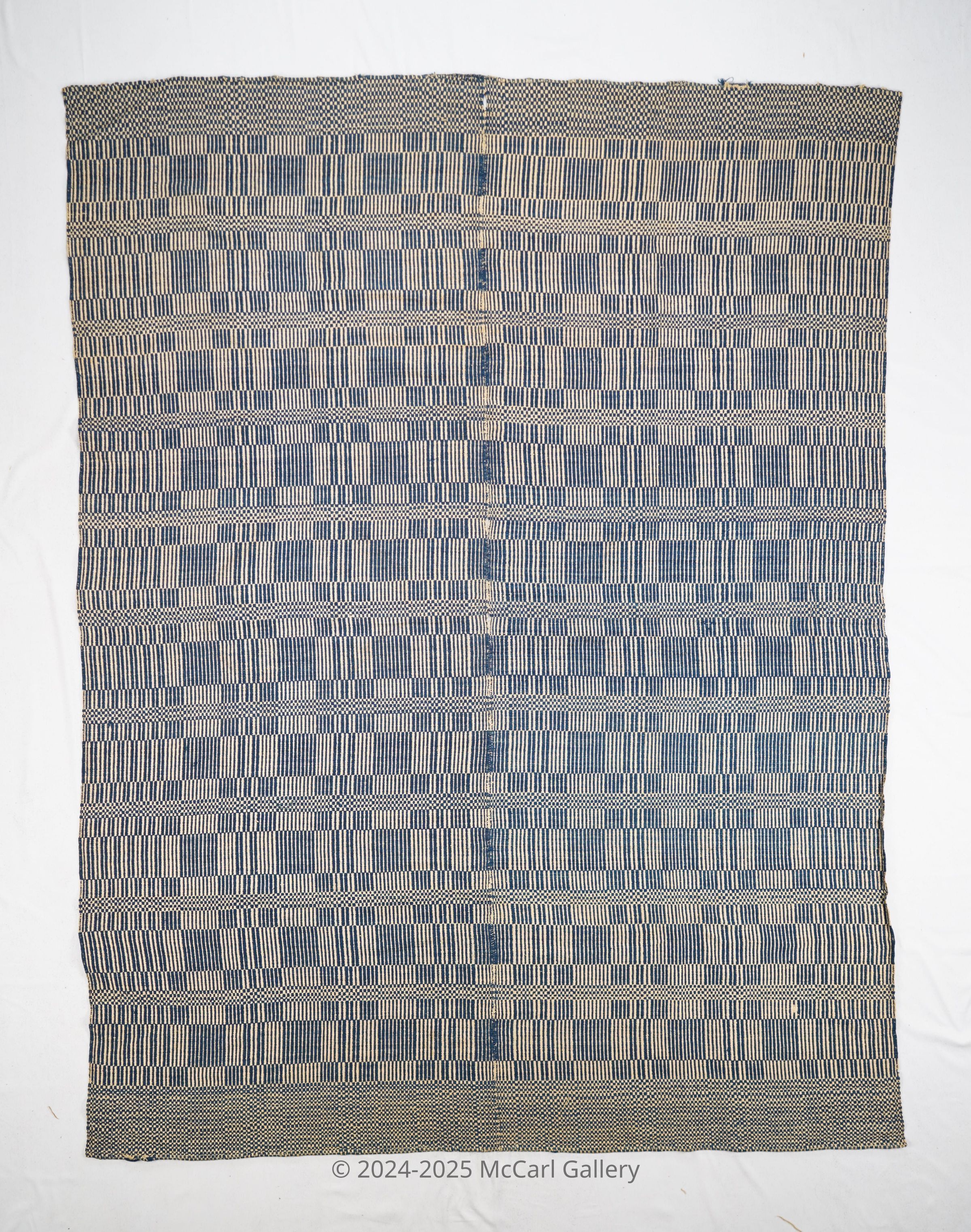 Natural and navy geometric weft-faced coverlet; two panels joined by a center seam. Border on four sides; no fringe.