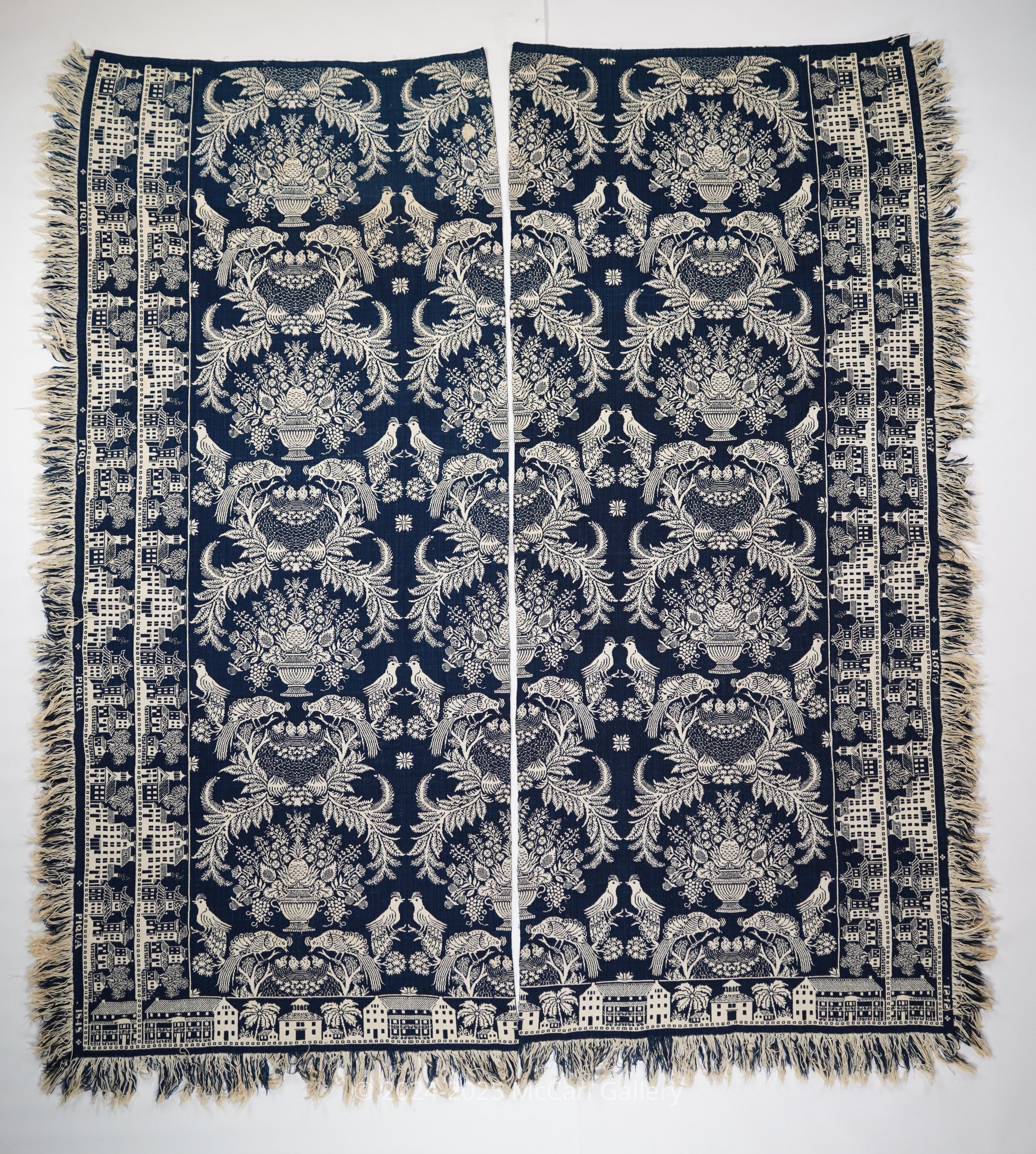 Navy and natural figured double weave coverlet with border and self-fringe on three sides. Two separated panels. Woven in Piqua, Miami Co., Ohio in 1848.Collection