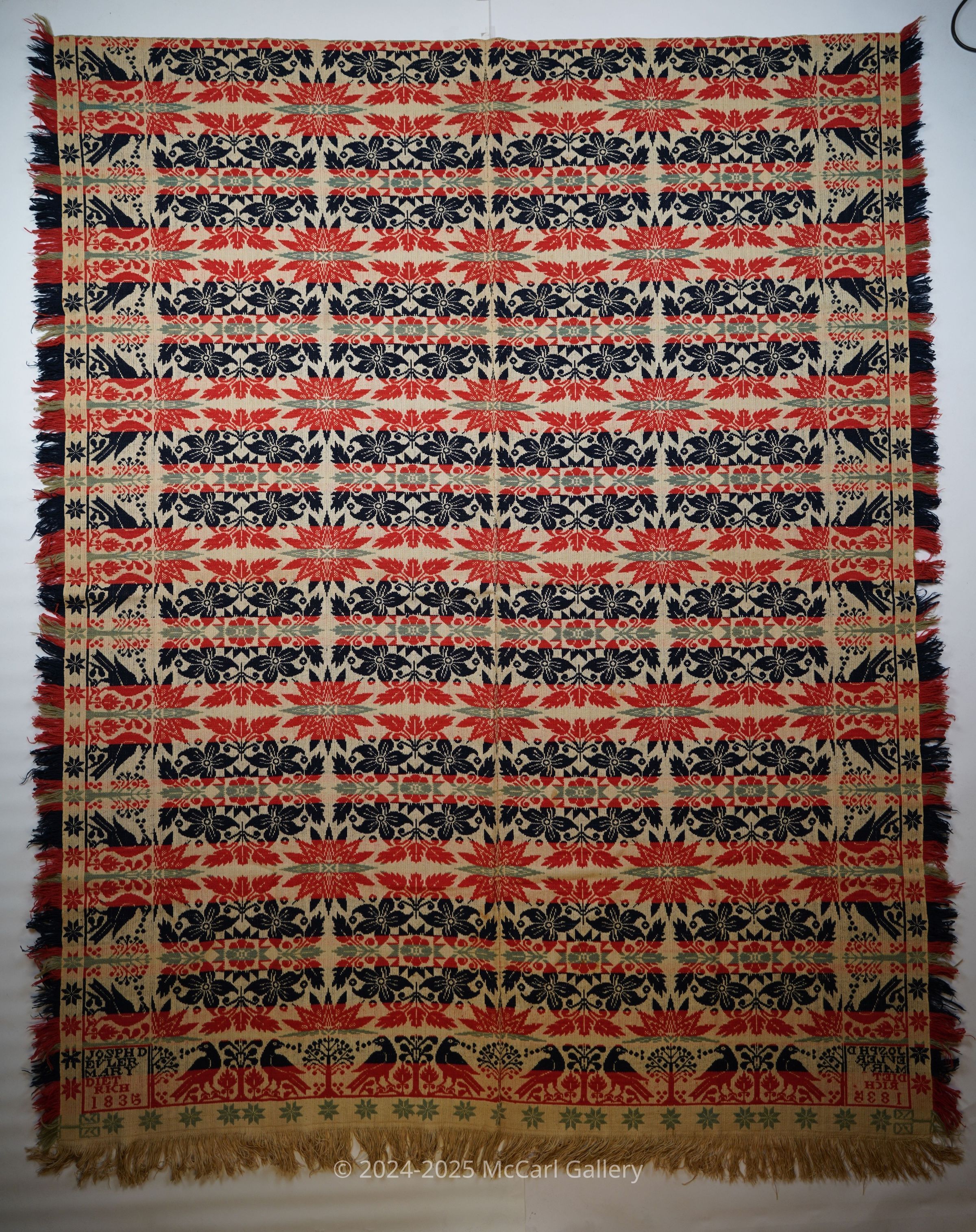 Green, red, navy, and natural figured tied half doublecloth coverlet with border and self-fringe on three sides. Two joined panels. Woven for Mary Dietrich by Joseph Dealer (Deavler) in Lancaster Co., Pennsylvania in 1835.Collection