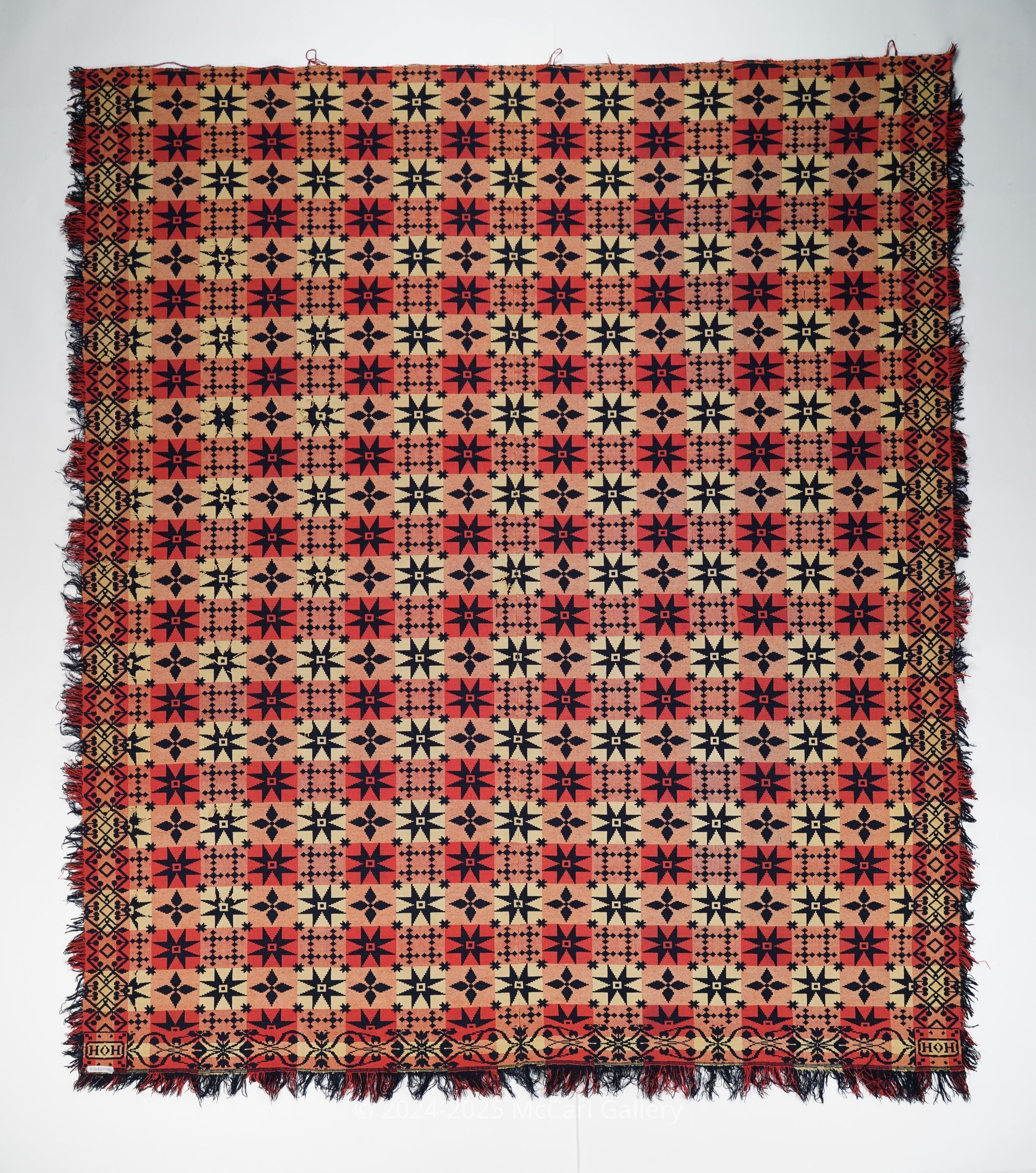 Red, navy blue, and natural figured doubleweave coverlet with borders and self-fringe on three sides. Geometric pattern with fancy borders. Henry Overholt was known to weave this uncommon pattern, which he signed with his full name in other coverlets.Collection