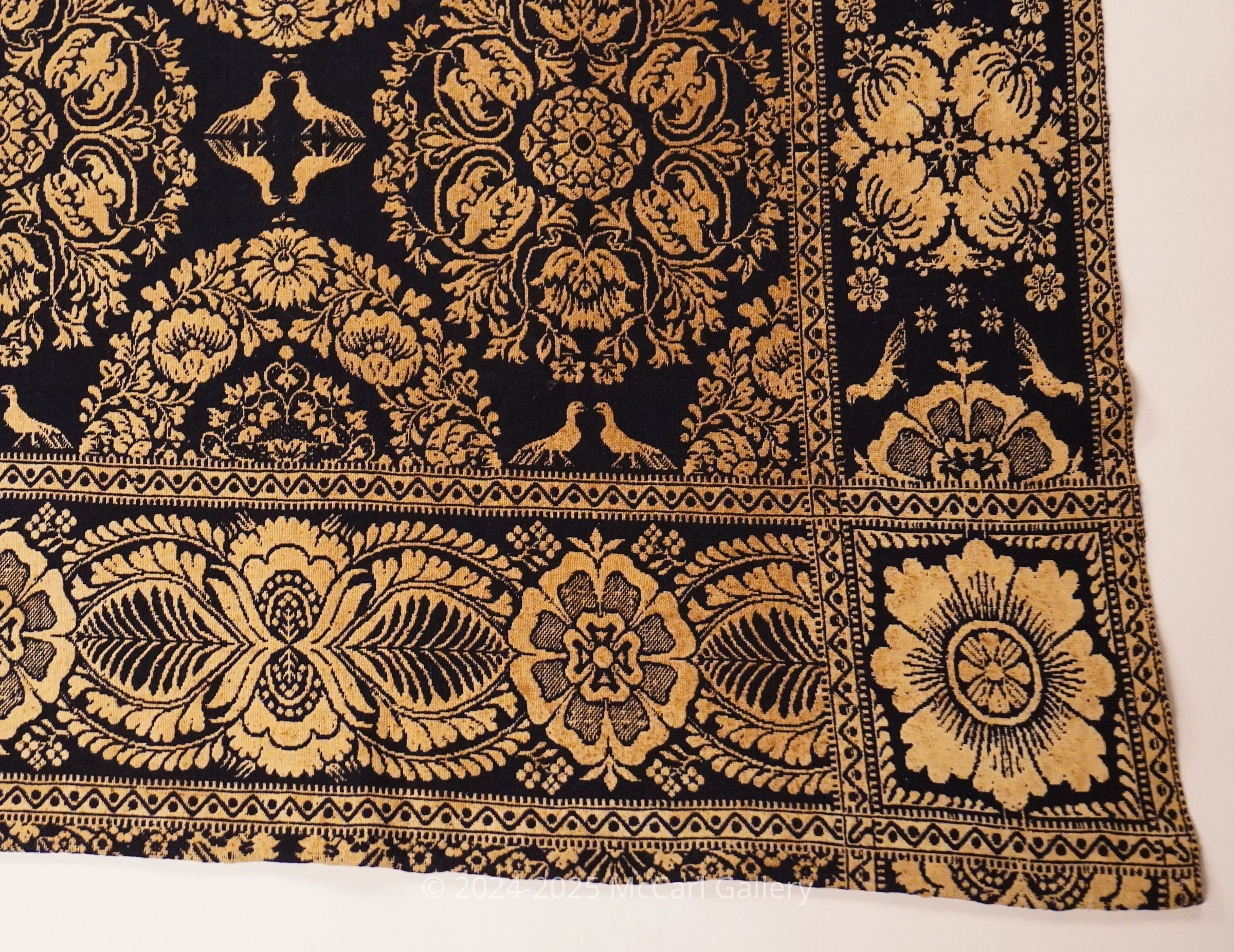 Navy and natural figured double weave coverlet with border on three sides. Two joined panels.