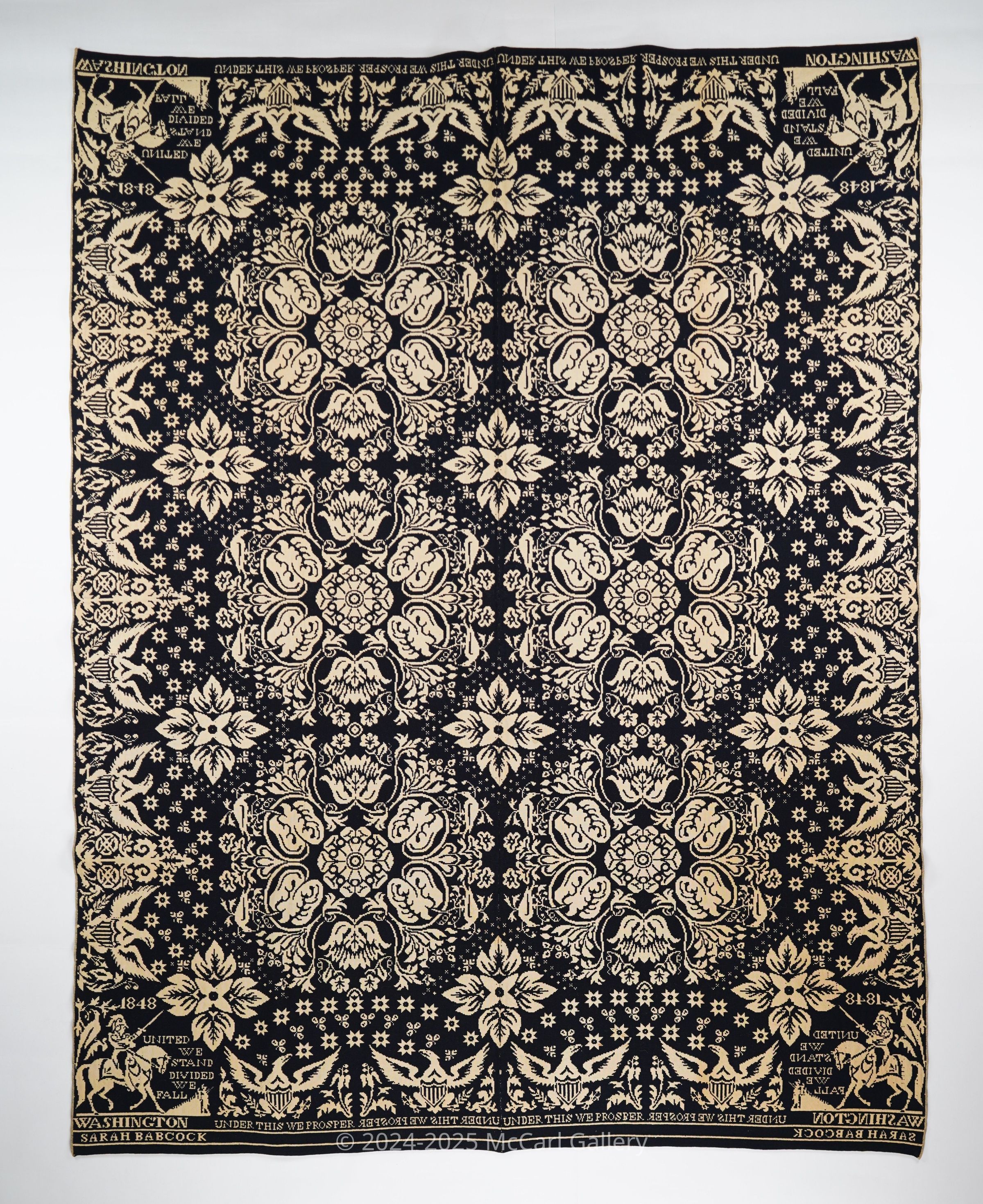 Navy and natural figured doubleweave coverlet with border on four sides. Two joined panels. Woven for Sarah Babcock in New York in 1848.Collection