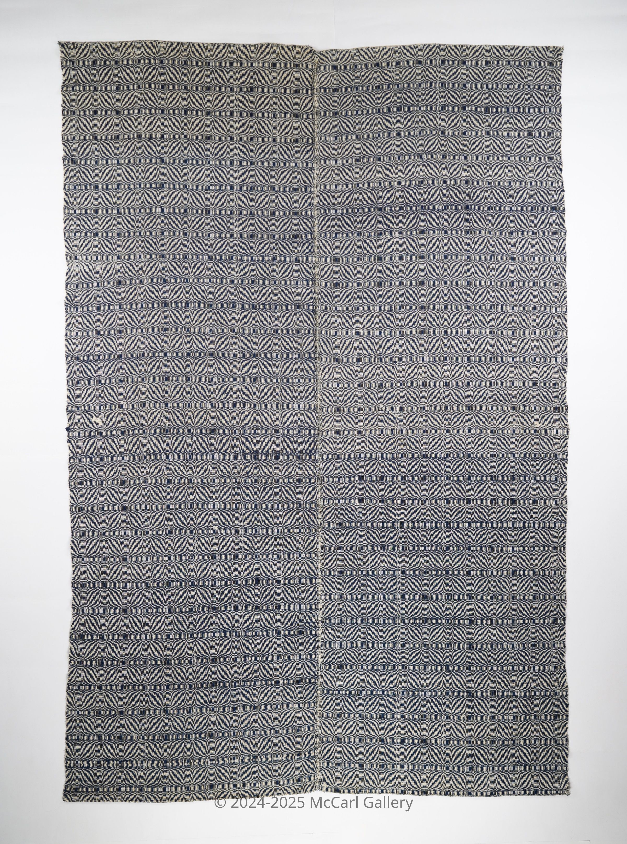 Navy and natural geometric overshot coverlet. Two joined panels. Double bowknot pattern.