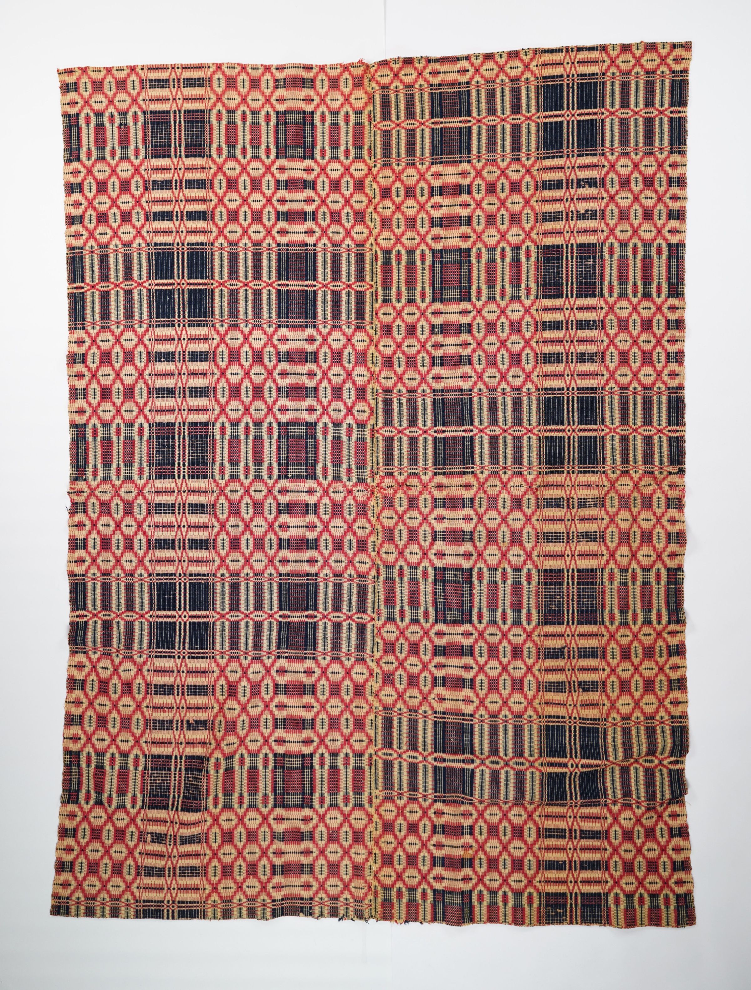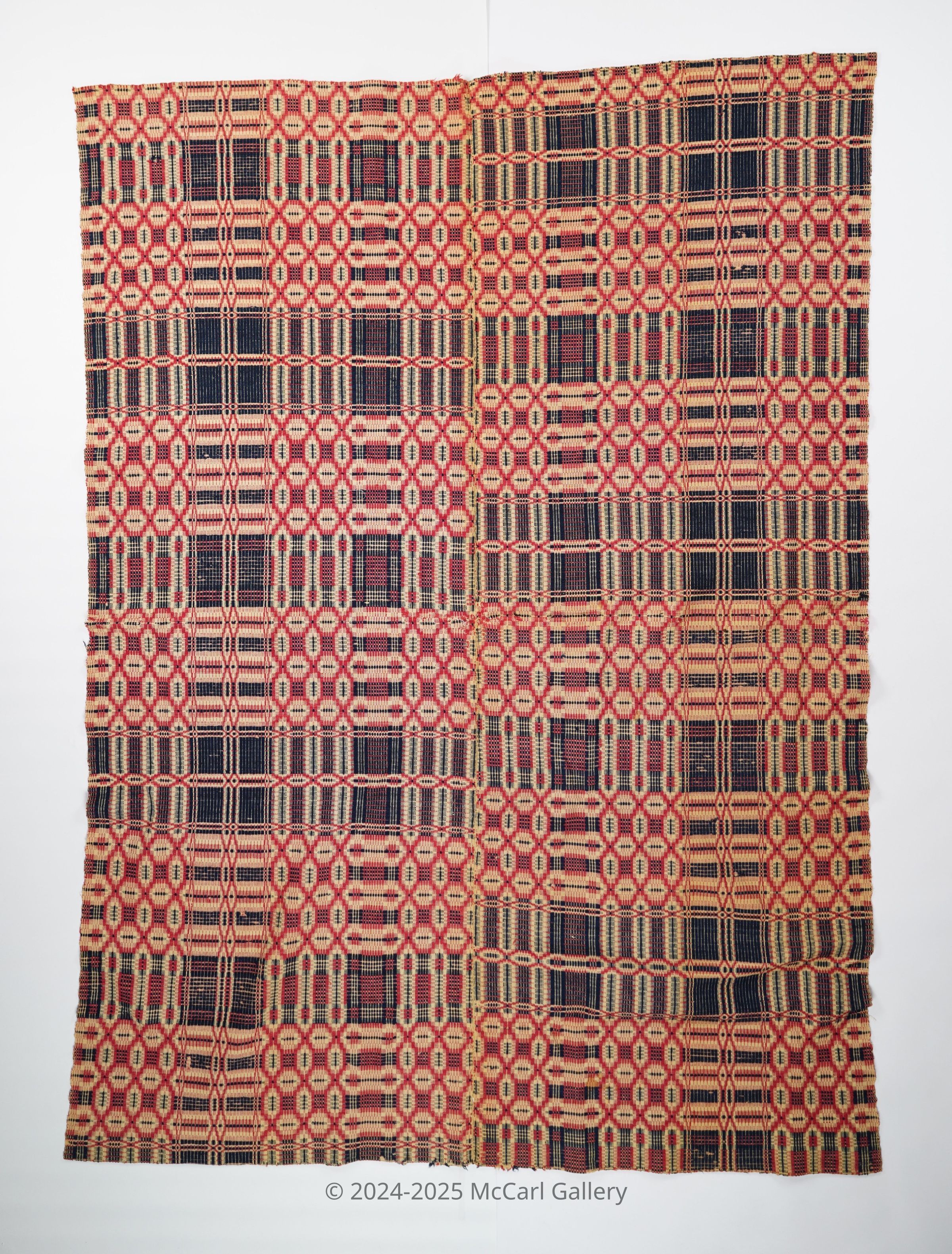 Pink, navy, and natural geometric overshot coverlet. Two joined panels.
