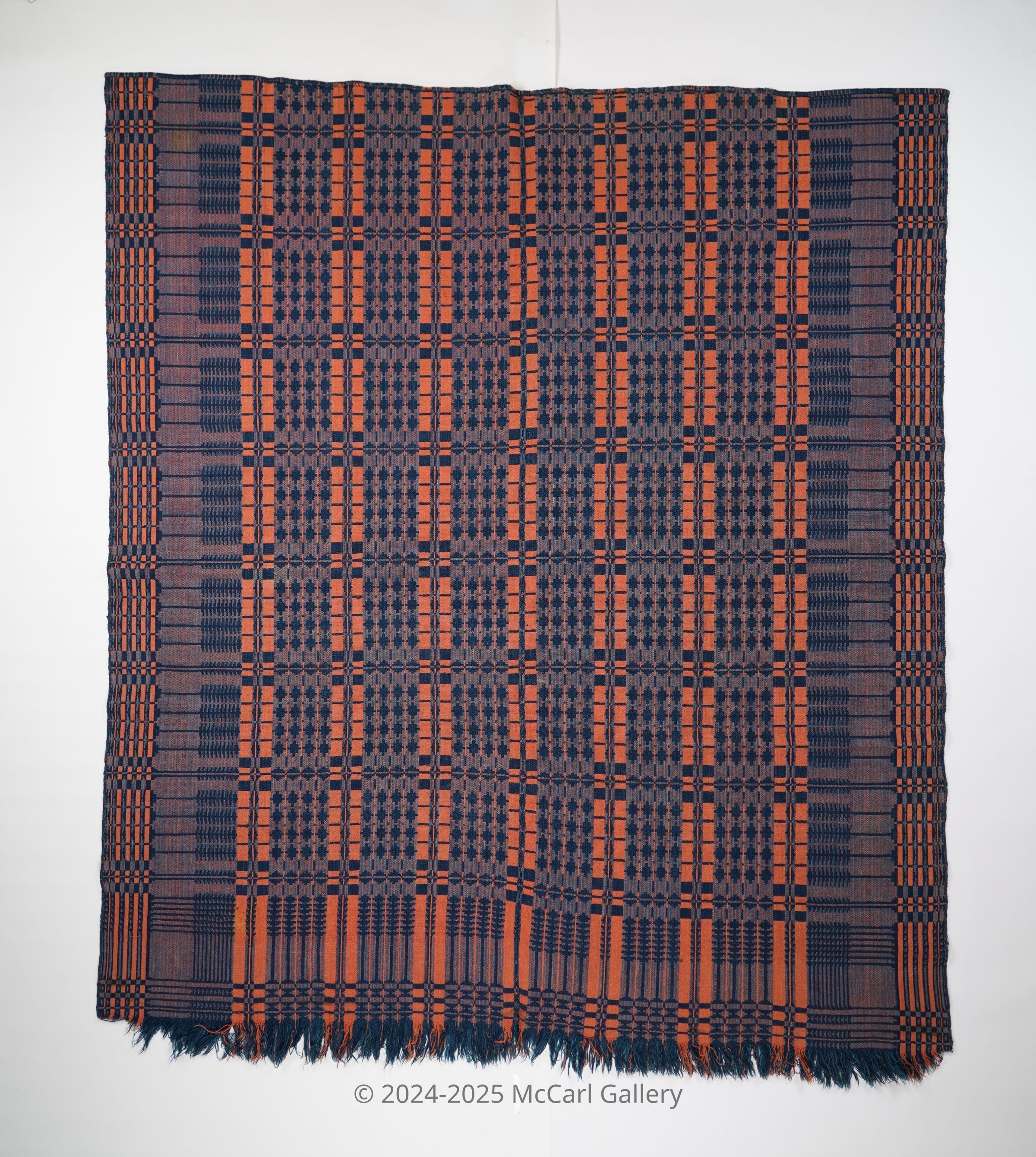 Red, blue, and navy geometric double weave coverlet with border on three sides and self-fringe along bottom. Two joined panels.Collection