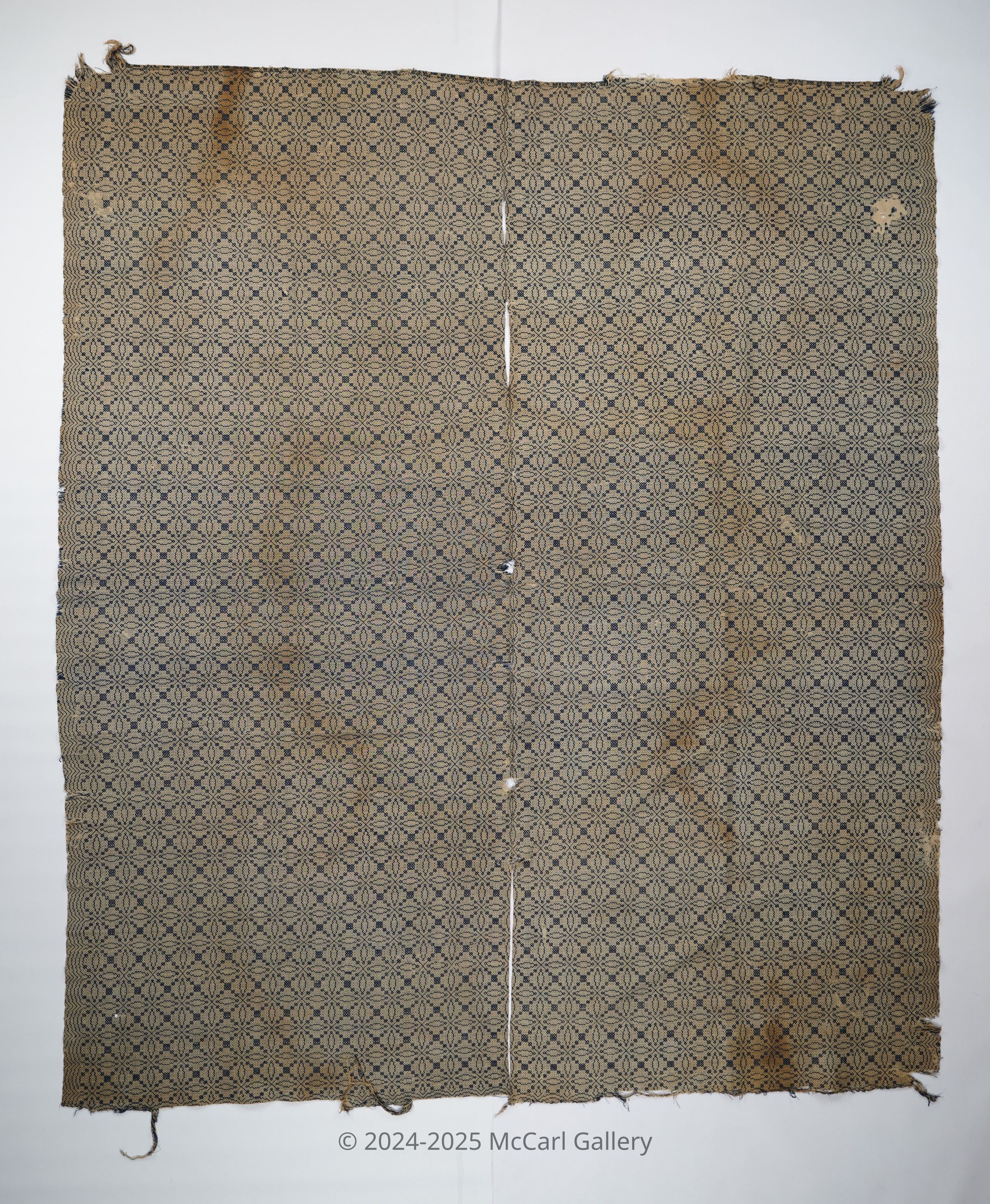 Navy and natural geometric gebrochene coverlet with border on left and right sides. Two joined panels.