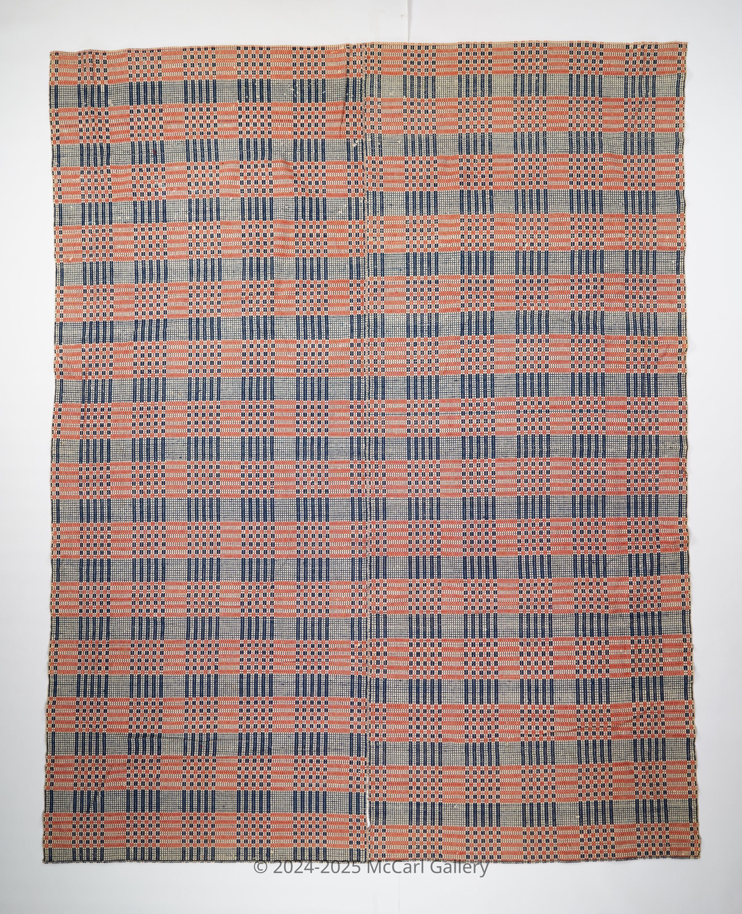 Red, navy, and natural geometric double weave coverlet. Two joined panels.