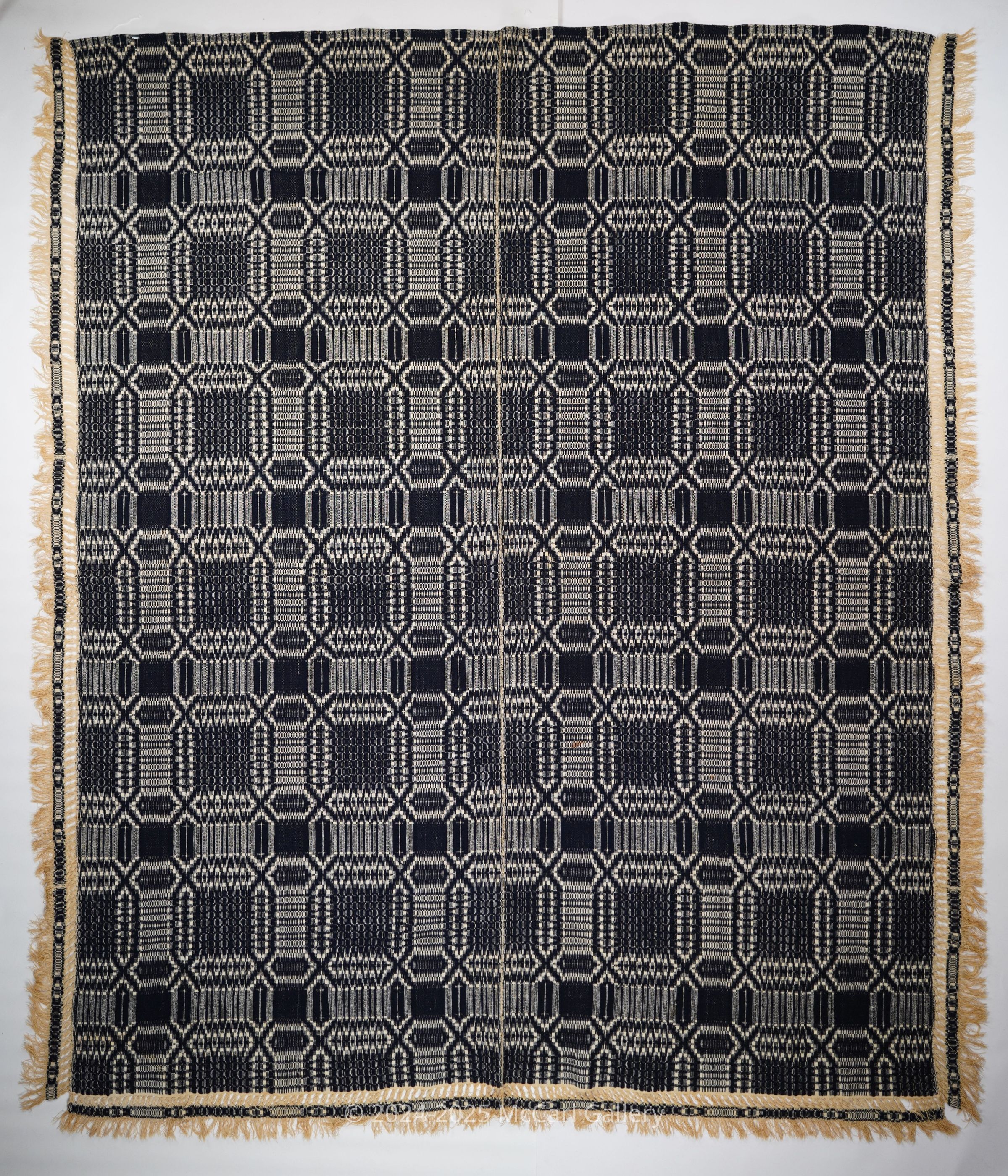 Navy and natural geometric overshot coverlet with self-fringe on three sides. Two joined panels