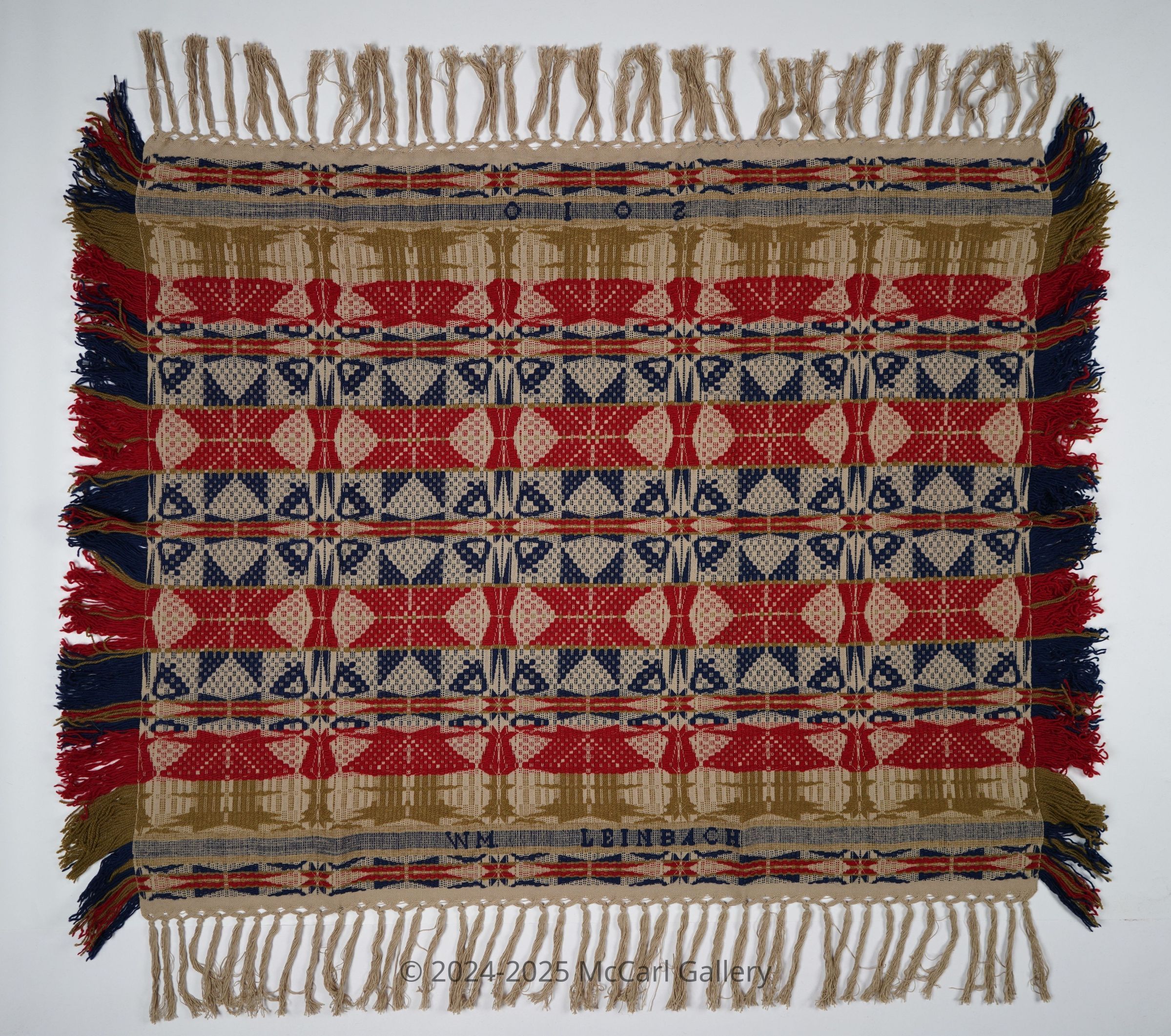 Yellow, red, navy, and natural geometric overshot crib coverlet with border on two sides and self-fringe on four sides. Woven by William Leinbach in Myerstown, Lebanon Co., Pennsylvania in 2010.Collection