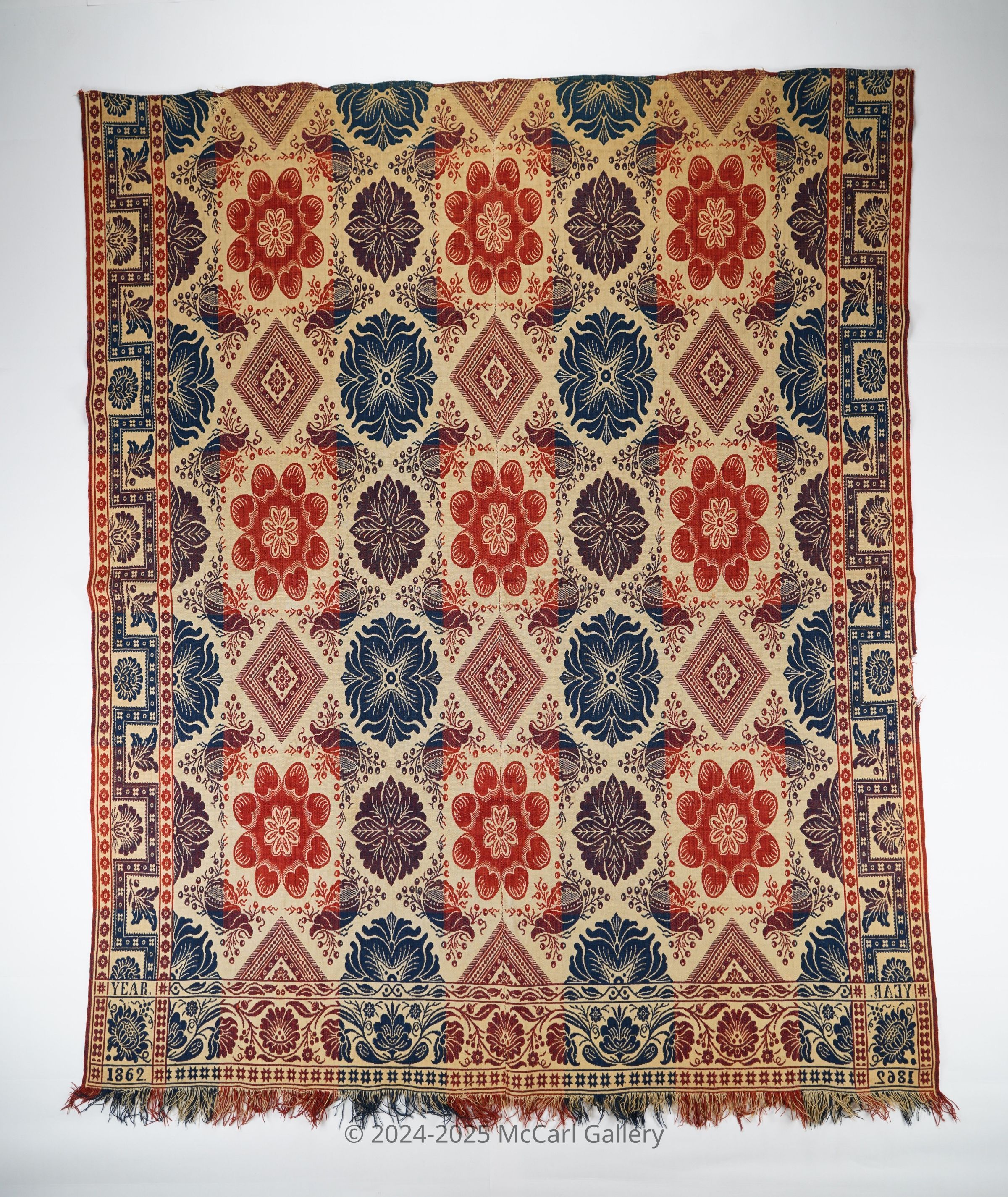 Red, navy, and natural figured doubleweave coverlet with border on three sides and self-fringe along bottom. Two joined panels. Woven by Henry or Sarah LaTourette in Covington, Fountain Co., Indiana in 1862, based on the "YEAR" Floral trademark.Collection