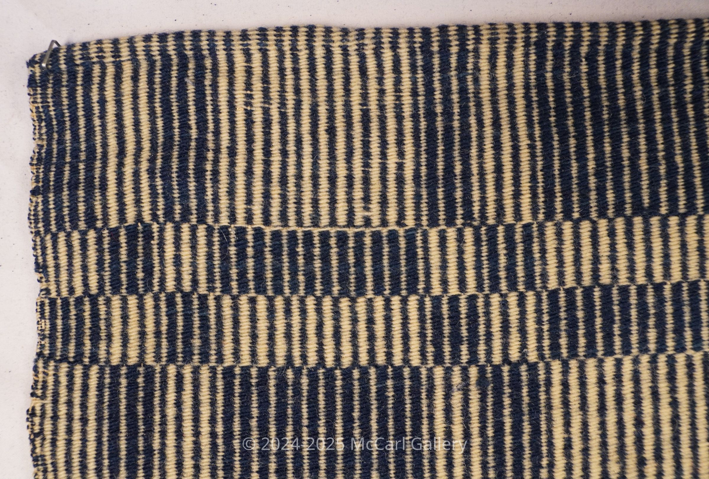 Natural and navy geometric weft faced coverlet; two panels joined by a center seam. No border on fringe,