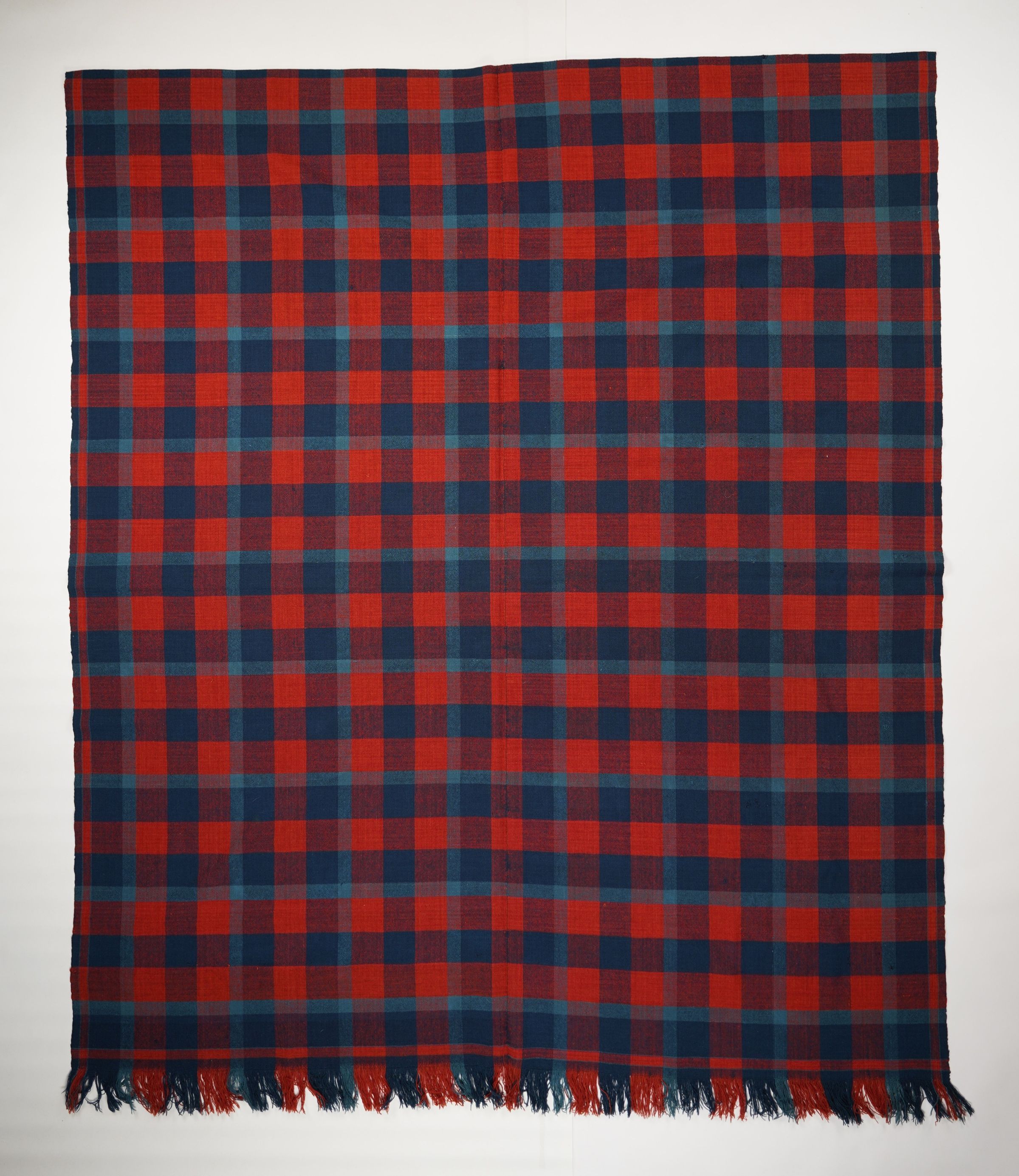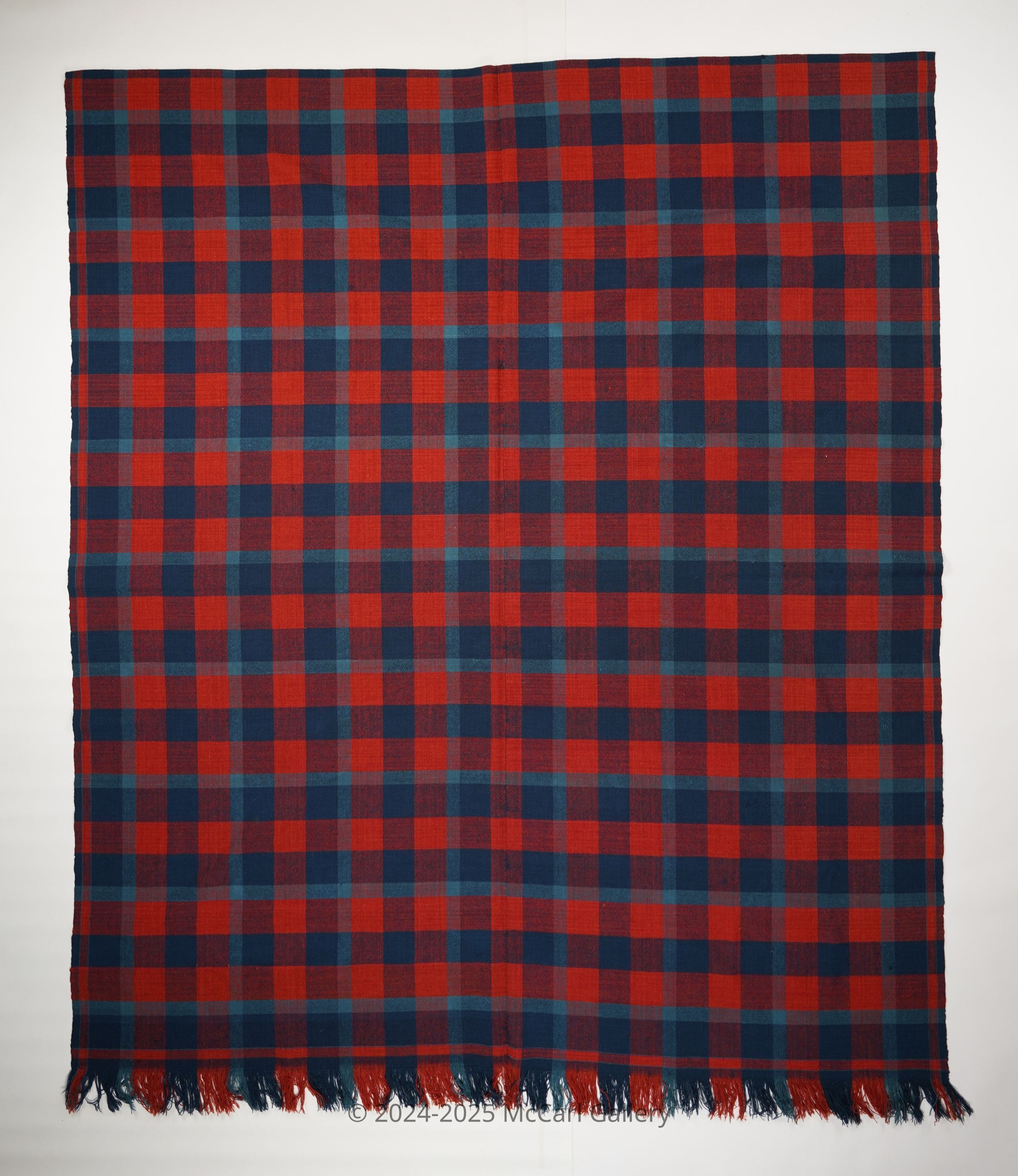 Red, navy, and blue geometric plain weave coverlet with self-fringe along bottom and border on three sides. Two joined panels.Collection