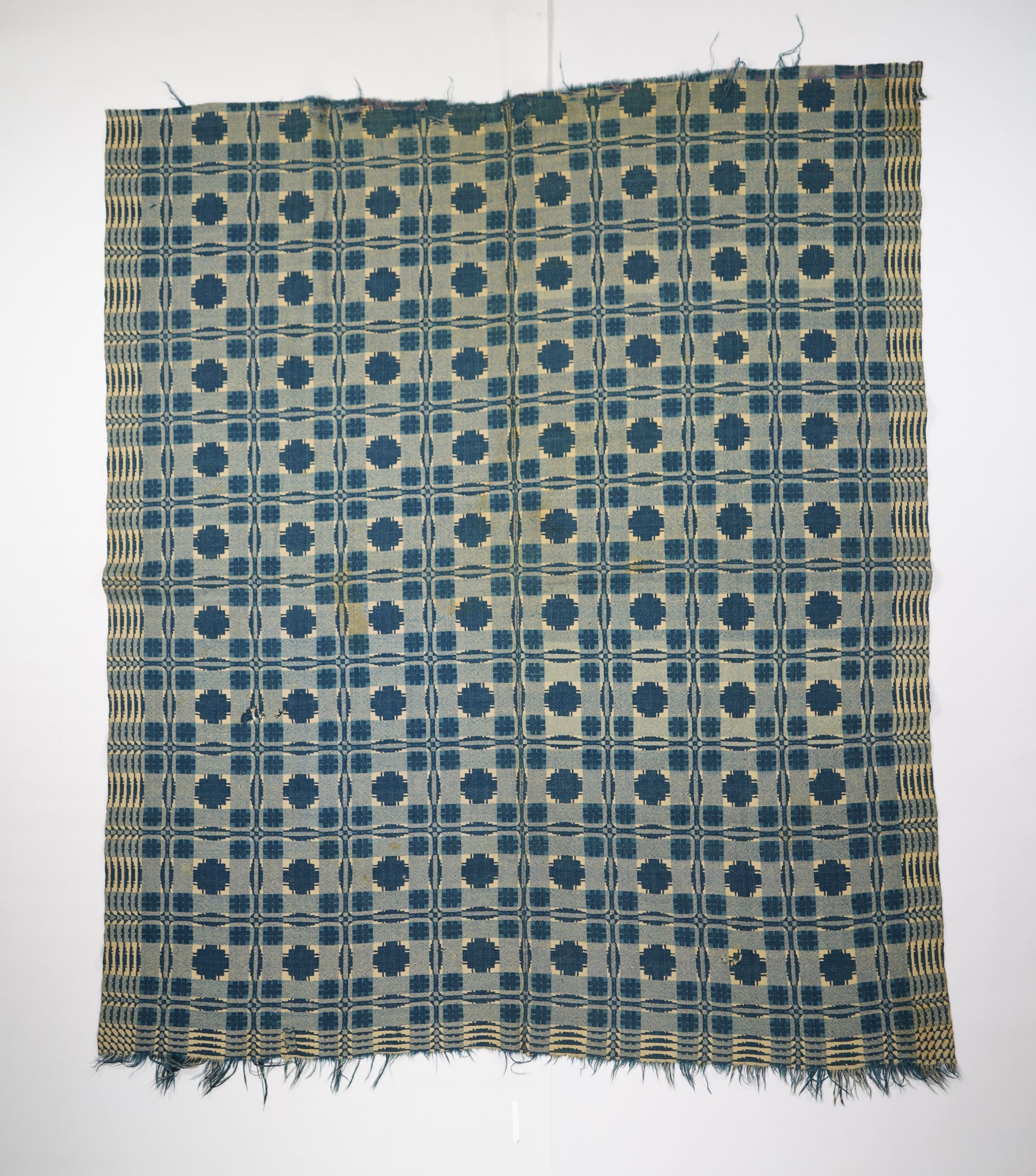 Blue, navy, and natural geometric double weave coverlet with border on three sides and self-fringe along bottom. Two joined panels.Collection
