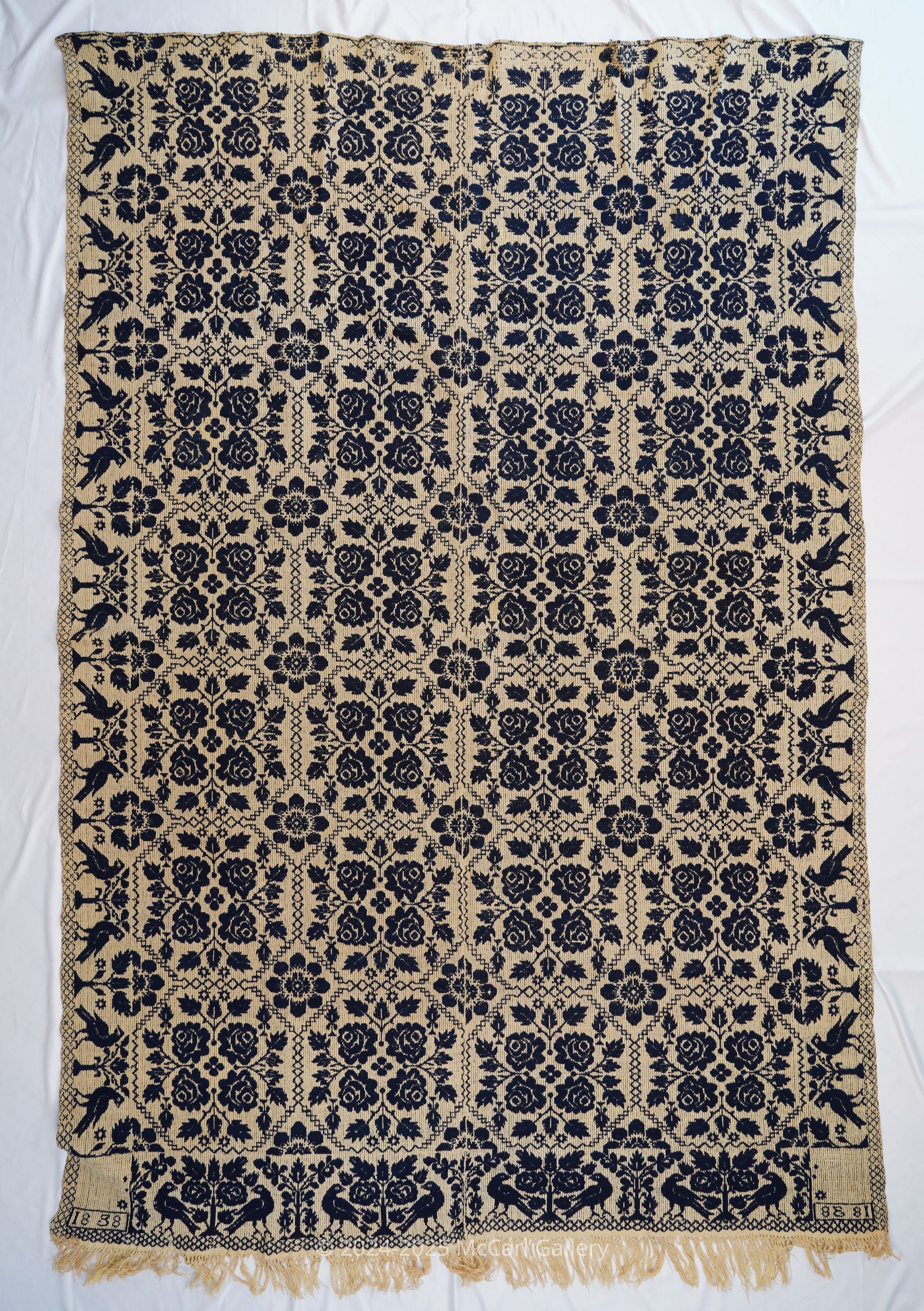 Navy and natural figured tied Beiderwand coverlet; two panels joined. Double roses and blossom grid centierfield pattern, distelfink border on three sides. Self-fringe on bottom.Collection