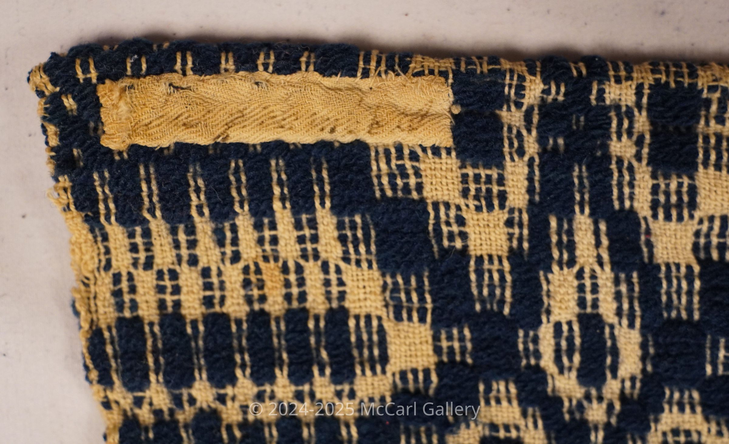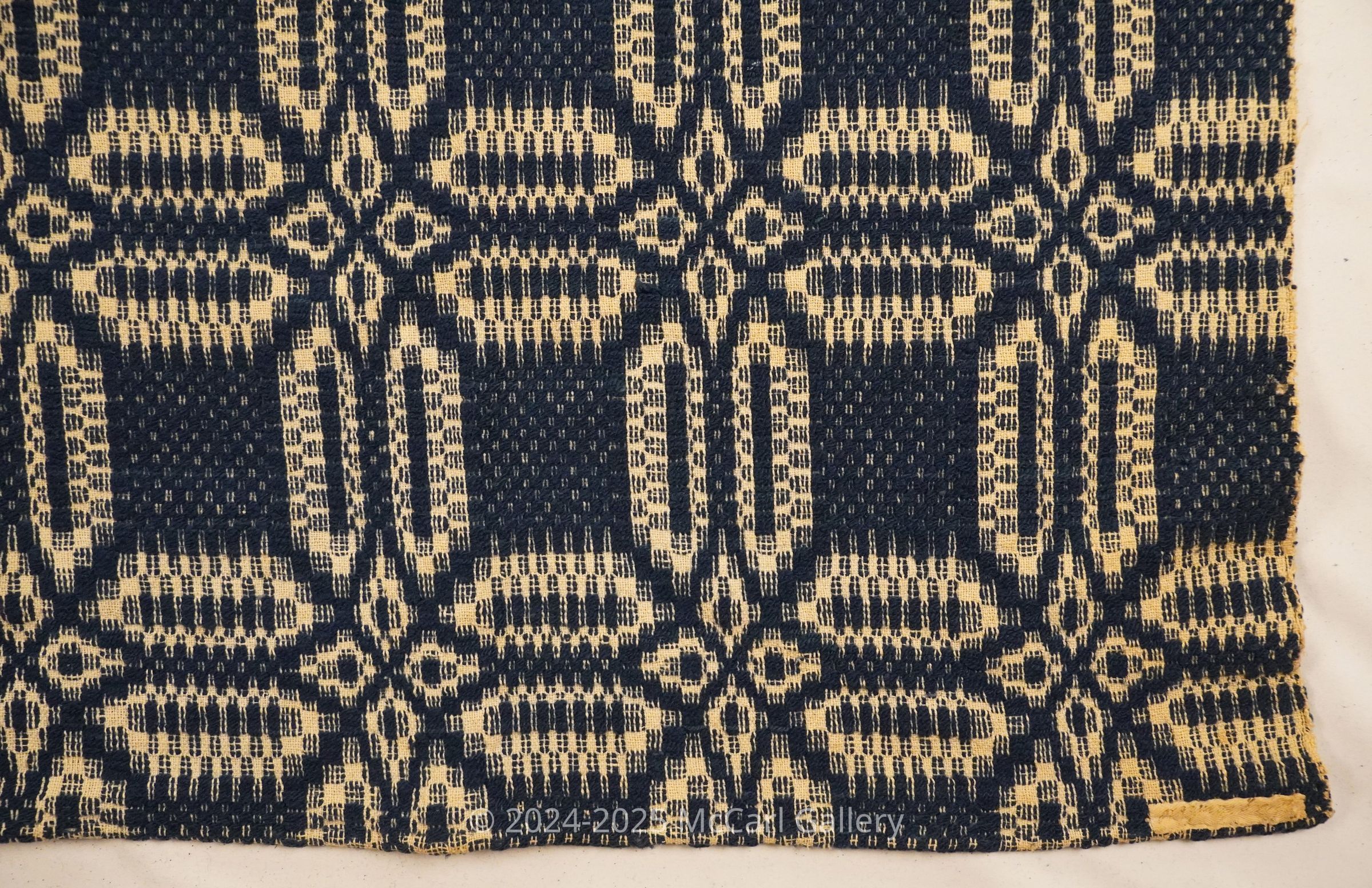 Natural and navy geometric overshot coverlet; two panels joined by a center seam. No fringe or border.
