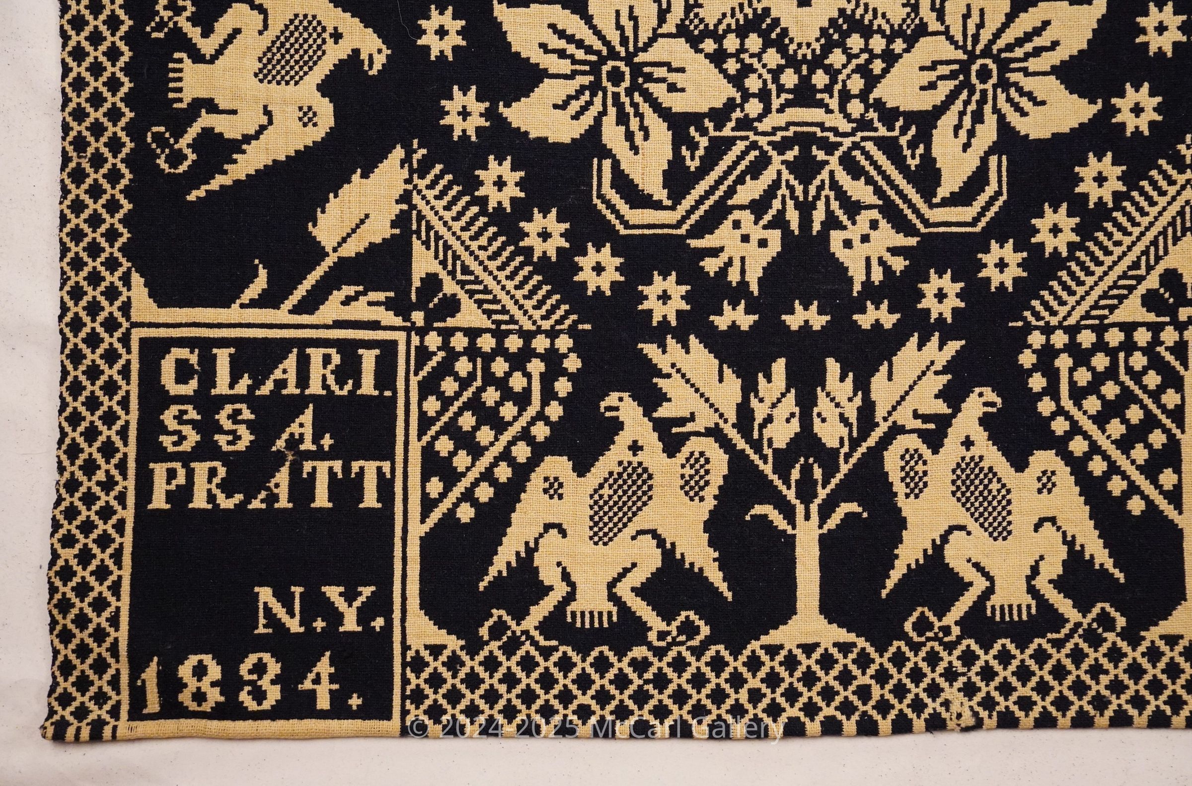Natural and Navy figured double weave coverlet; two panels joined by a center seam. No fringe; border on three sides.Collection