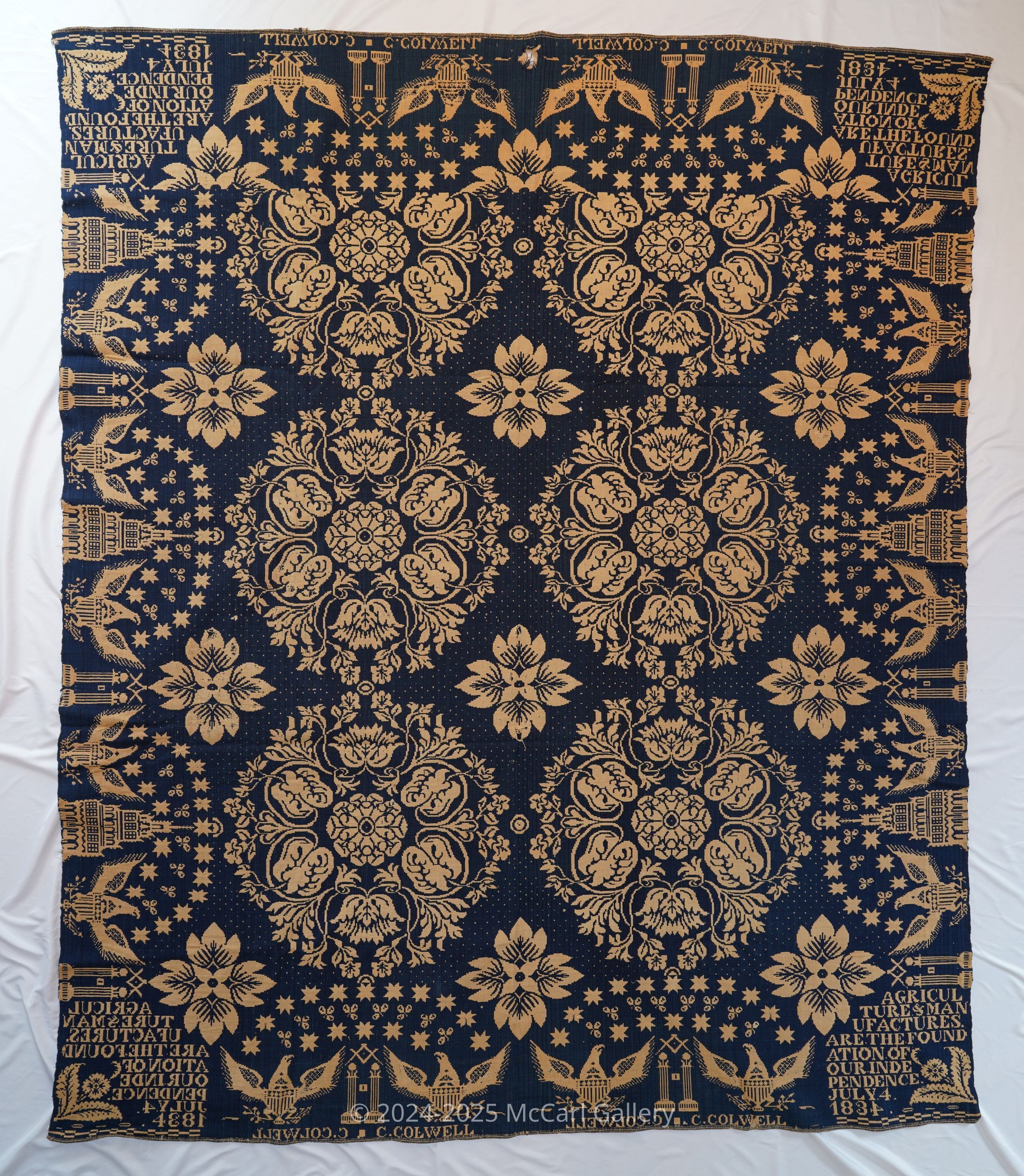 **This entry has photos of two different coverlets** Natural and navy figured double weave coverlet; seamless. Border on four sides, no fringe.Collection