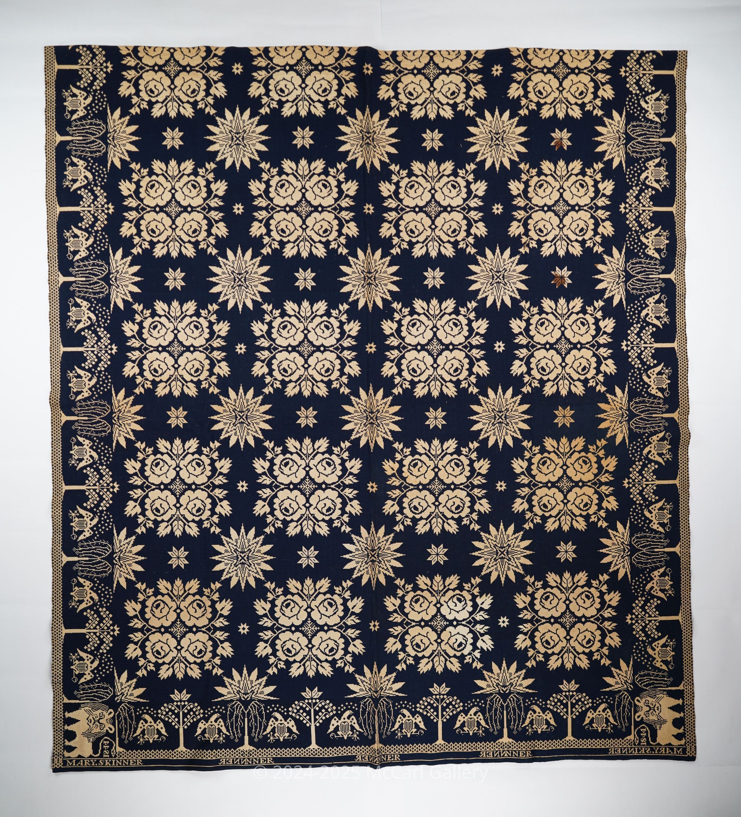 Navy and natural figured doubleweave coverlet with border on three sides. Two joined panels. Woven for Mary Skinner by Harry Tyler in Jefferson Co., New York in 1844.Collection