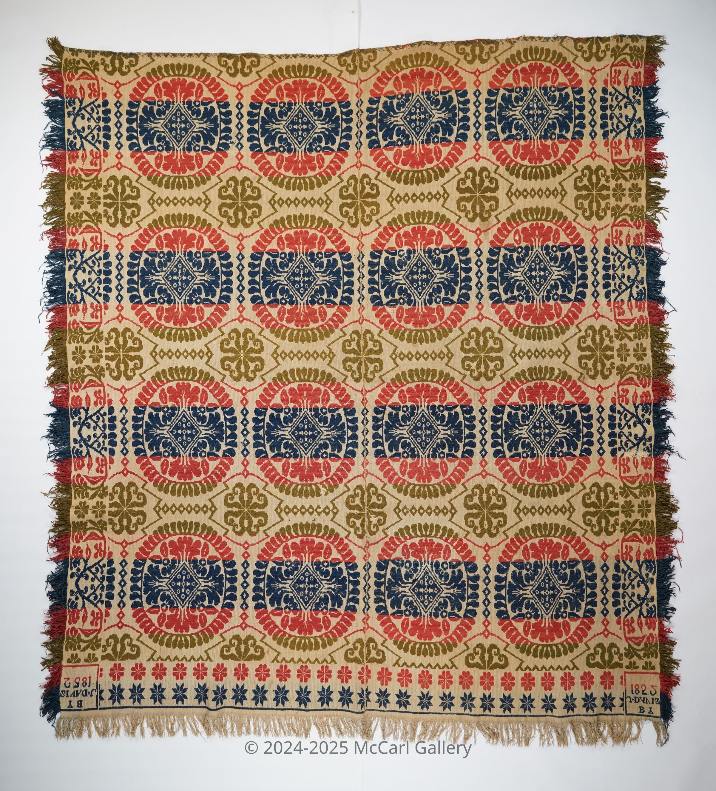Red, green, navy, and natural figured tied beiderwand coverlet with border and self-fringe on three sides. Two joined panels. Woven by J. Davis in 1852.Collection