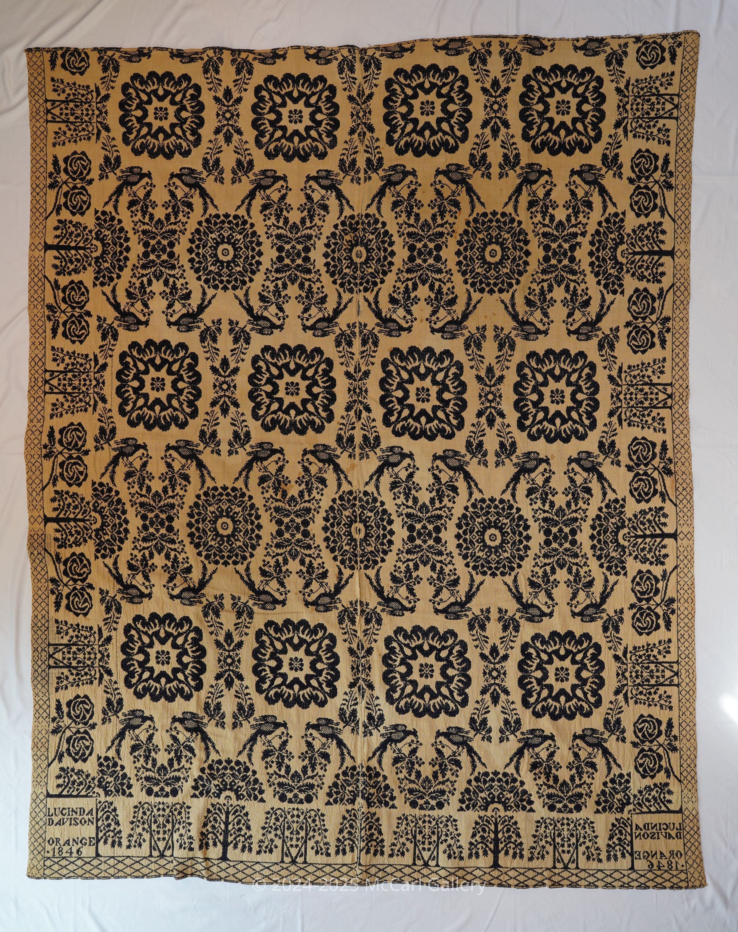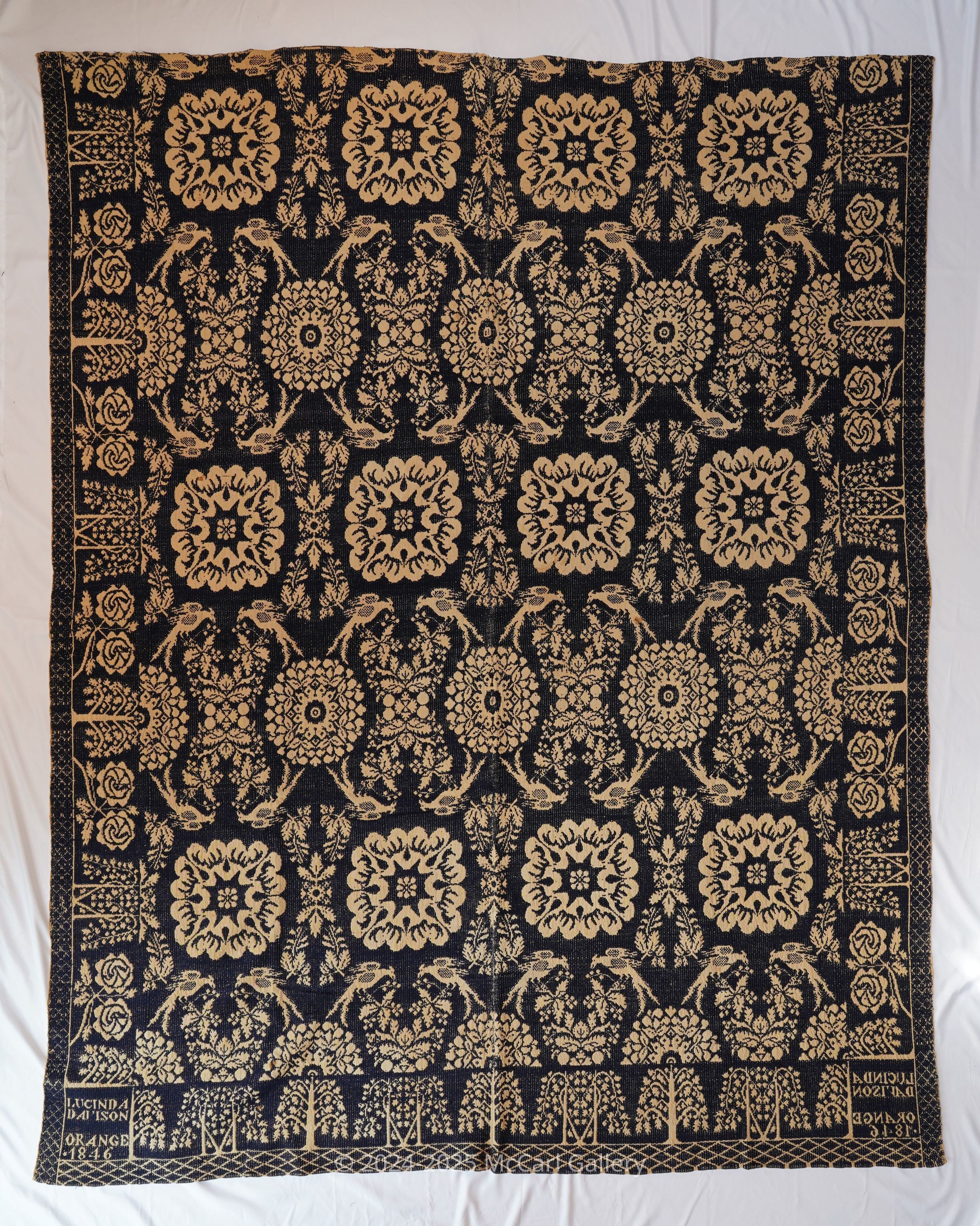Natural and navy figured double weave coverlet; two panels joined by a center seam. Border on three sides, no fringe.Collection