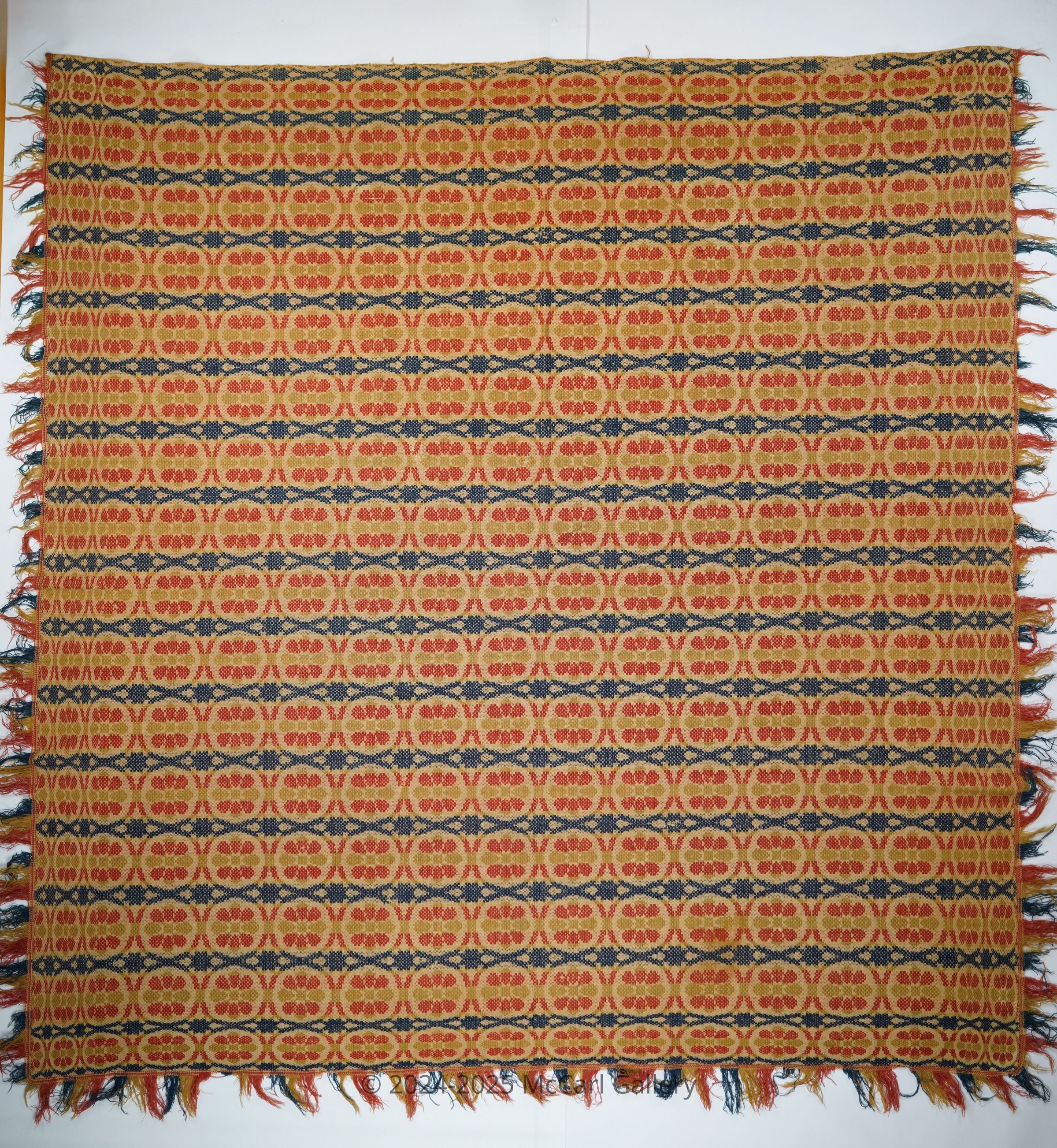 Red, yellow, navy, and natural geometric starwork coverlet with border and applied fringe on three sides.Collection