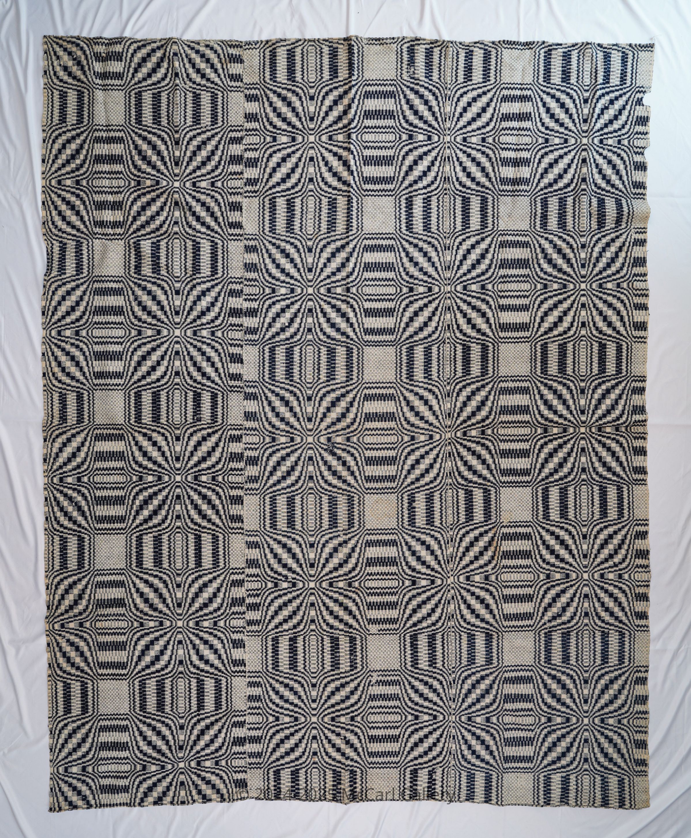 Navy and natural geometric coverlet; two panels joined. Summer and winter weave. Natural cotton tabby and navy wool pattern weft.