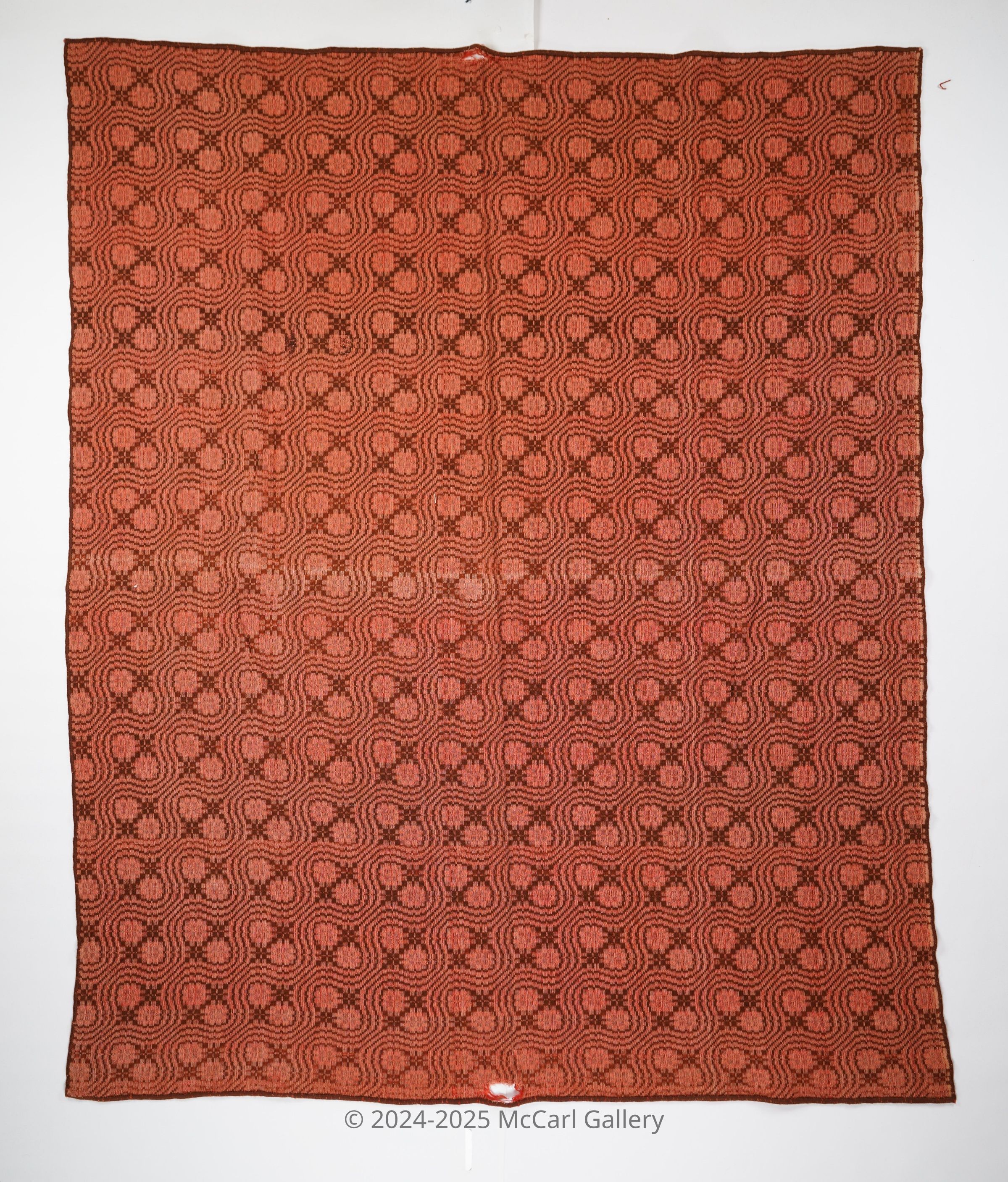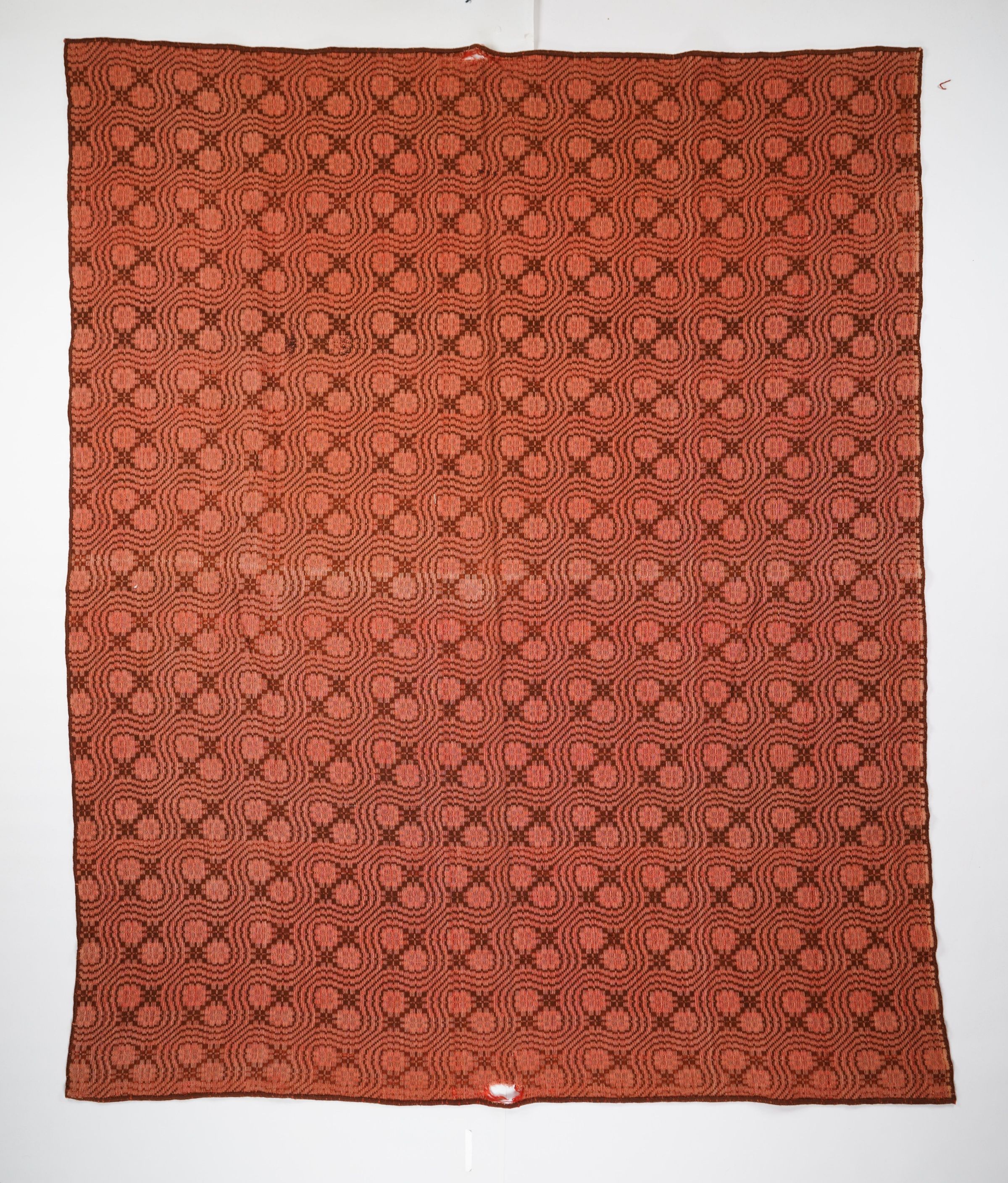 Red and brown geometric overshot coverlet in "Cat Track and Snail Trail" pattern. Two joined panels.