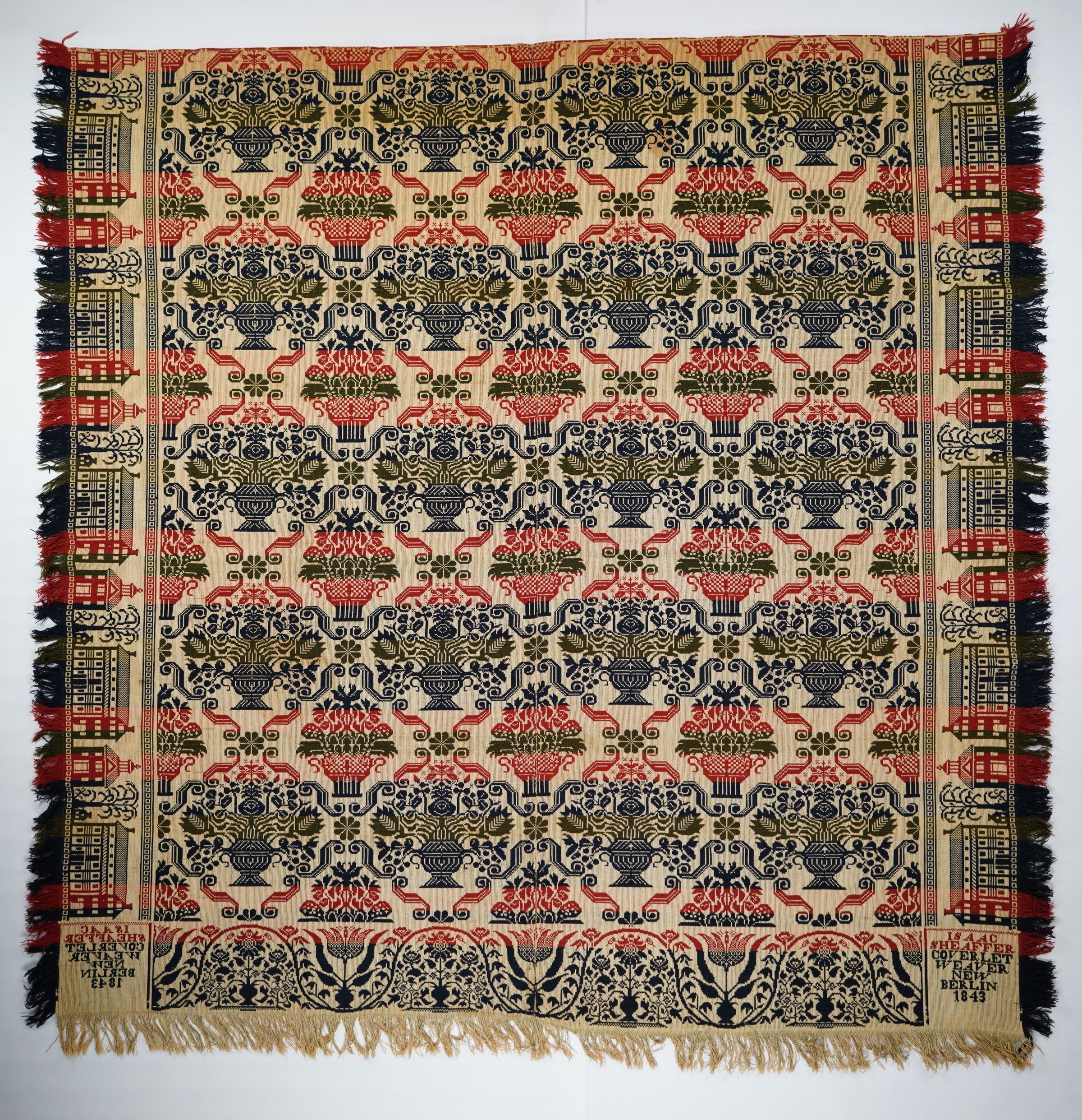 Navy, green, red, and natural figured tied beiderwand coverlet with self-fringe and border on three sides. The left and right border features a town and the bottom border features abstract flowers. Woven by Isaac Sheaffer in New Berlin (now North Canton), Stark Co., Ohio, in 1843.Collection