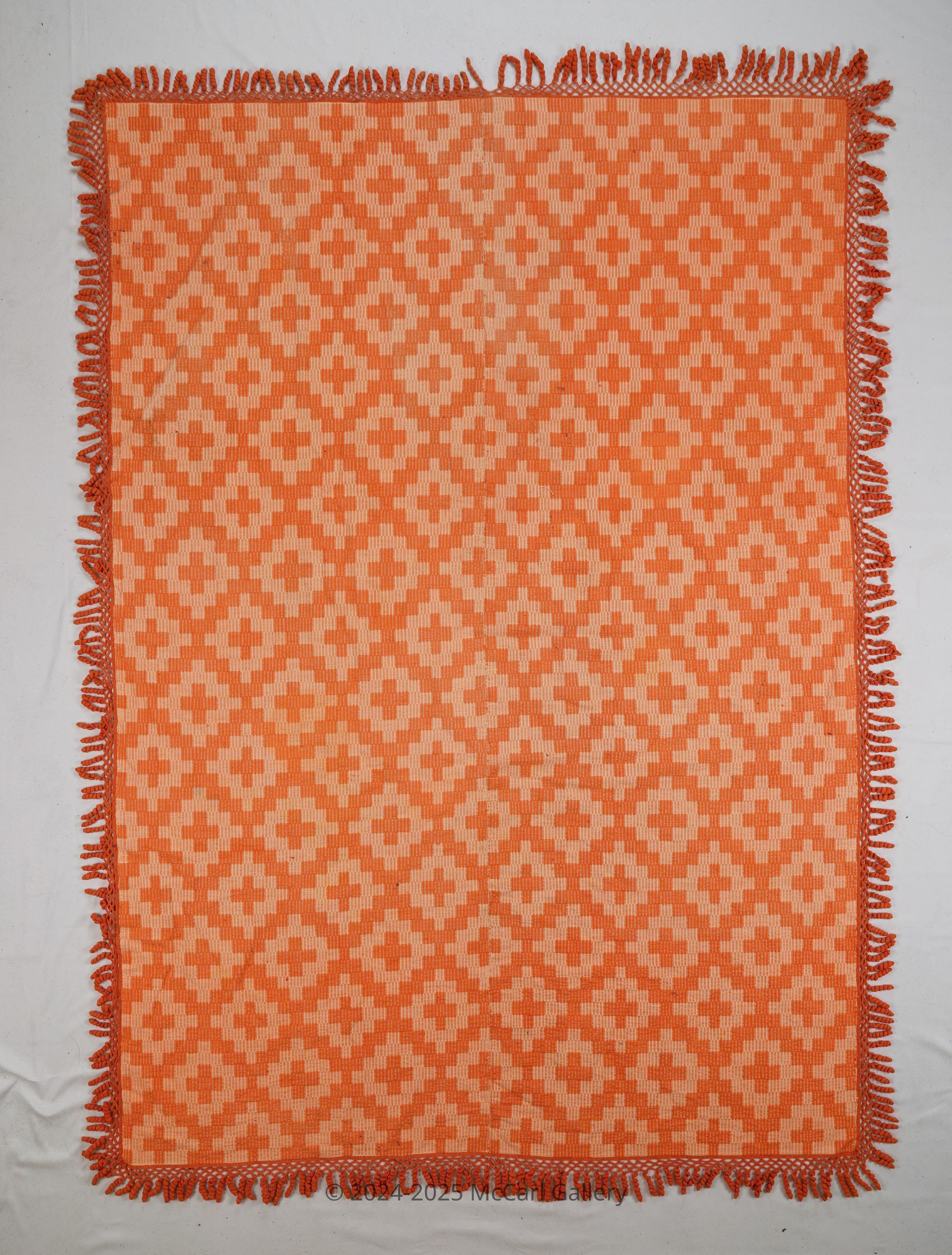 Orange and natural geometric Overshot coverlet; two panels joined by a center seam. Curly/crochet fringe on four sides.Collection