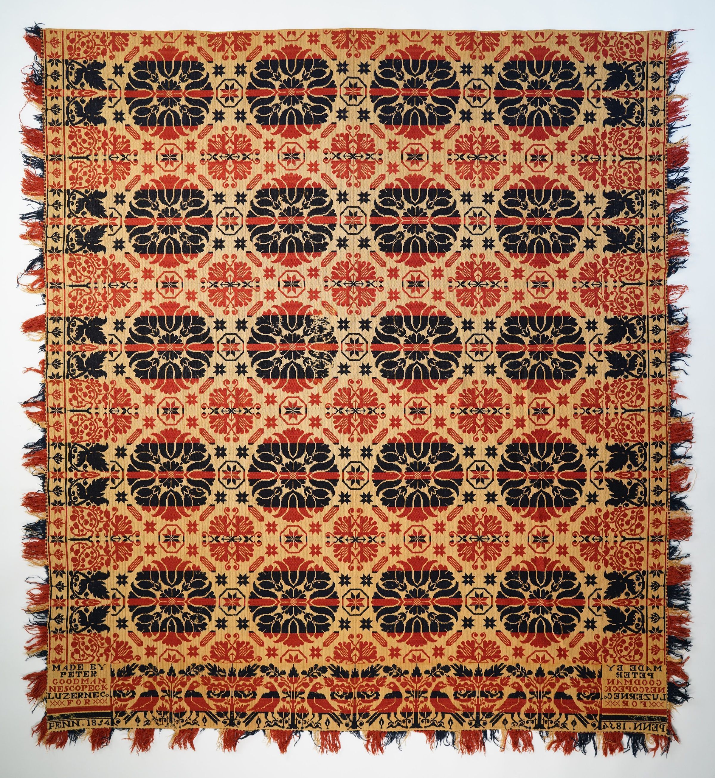 Red and navy figured Tied Beiderwand coverlet; seamless; distelfink border on bottom; star-edged grapevine border on sides; applied fringe on three sides; tulip medallions, star, and fan in centerfield pattern.