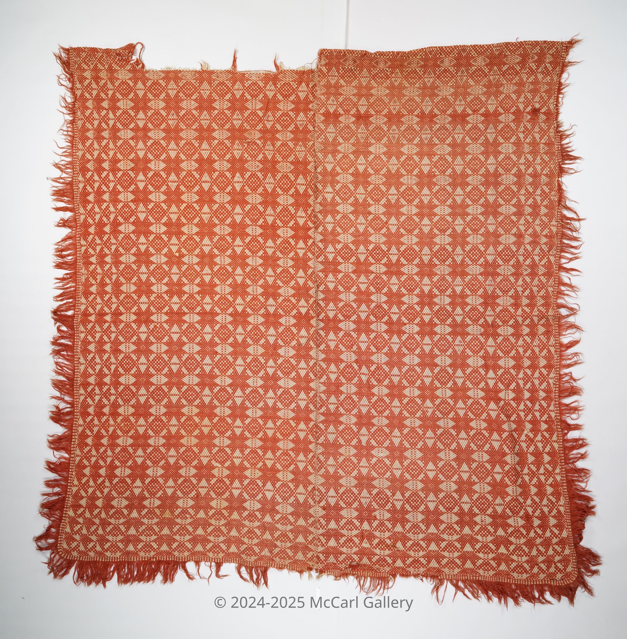 Red and natural geometric starwork coverlet with border and applied fringe on three sides. Two joined panels.