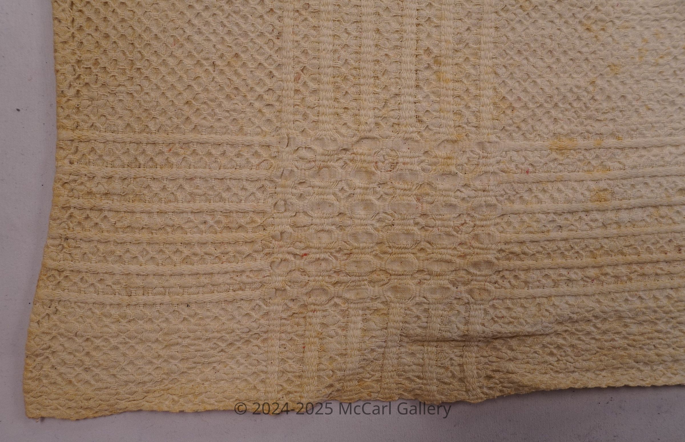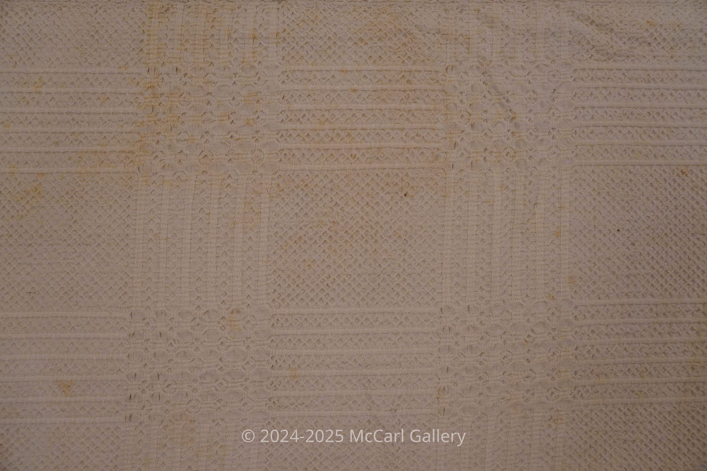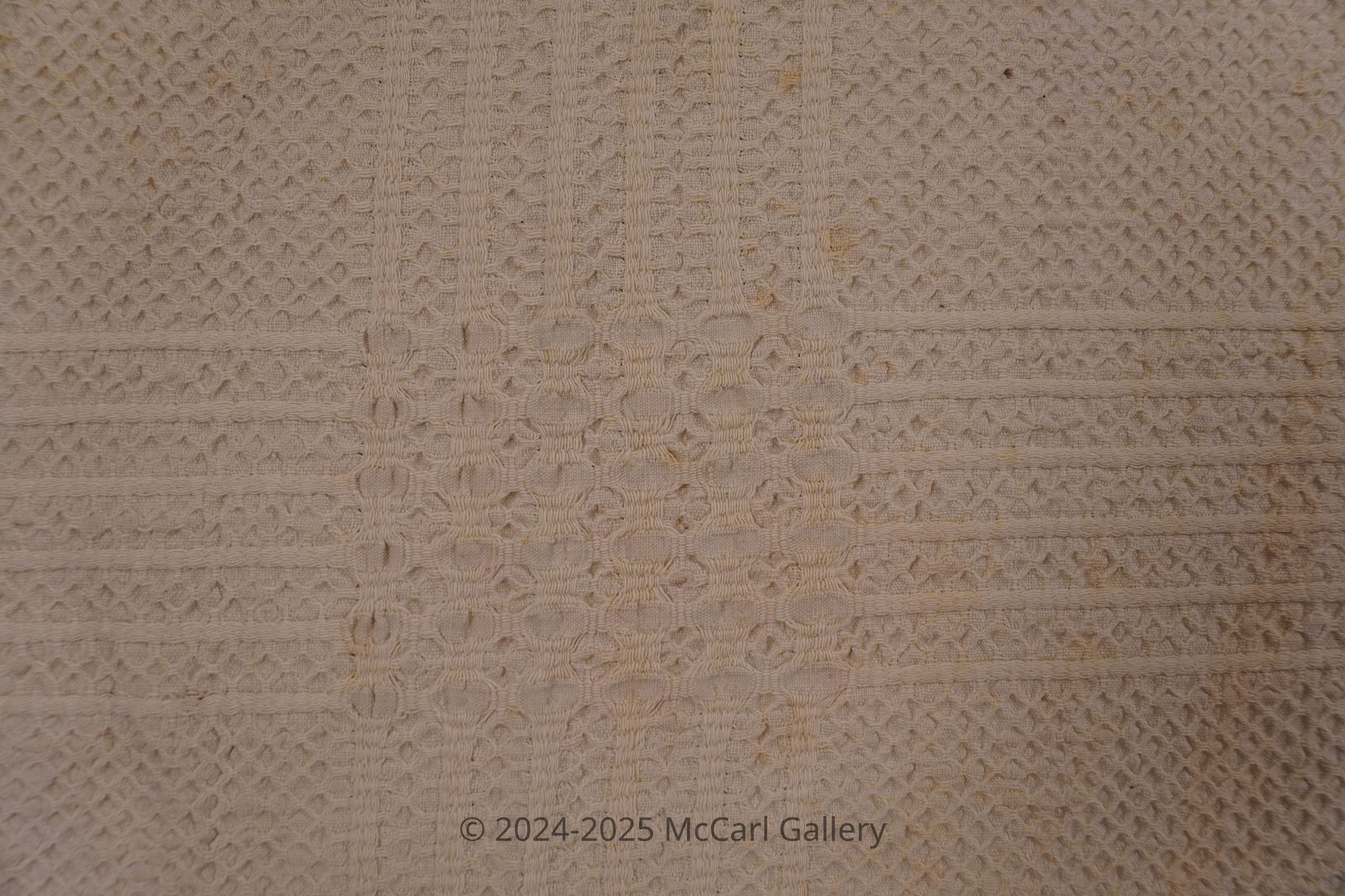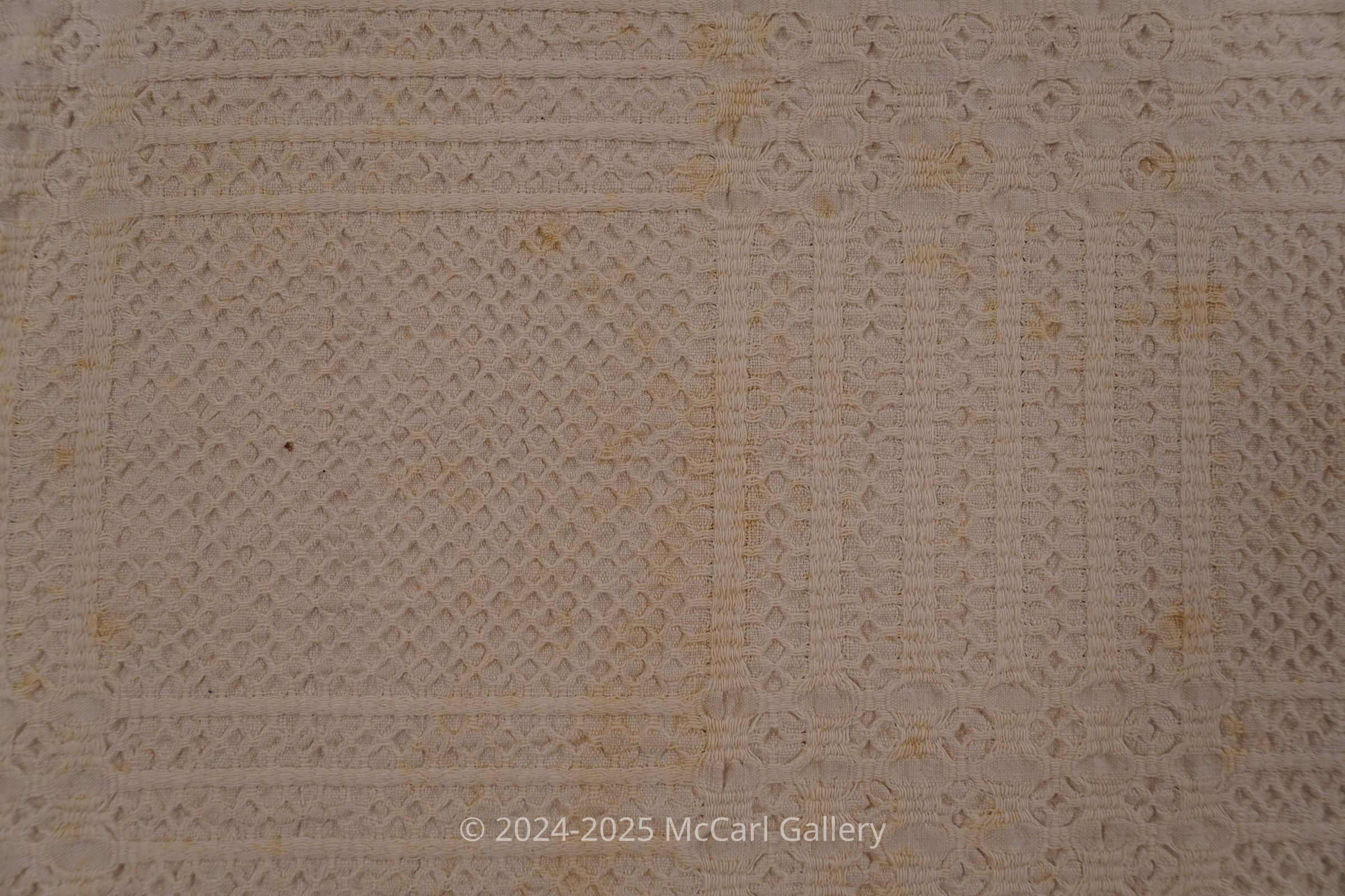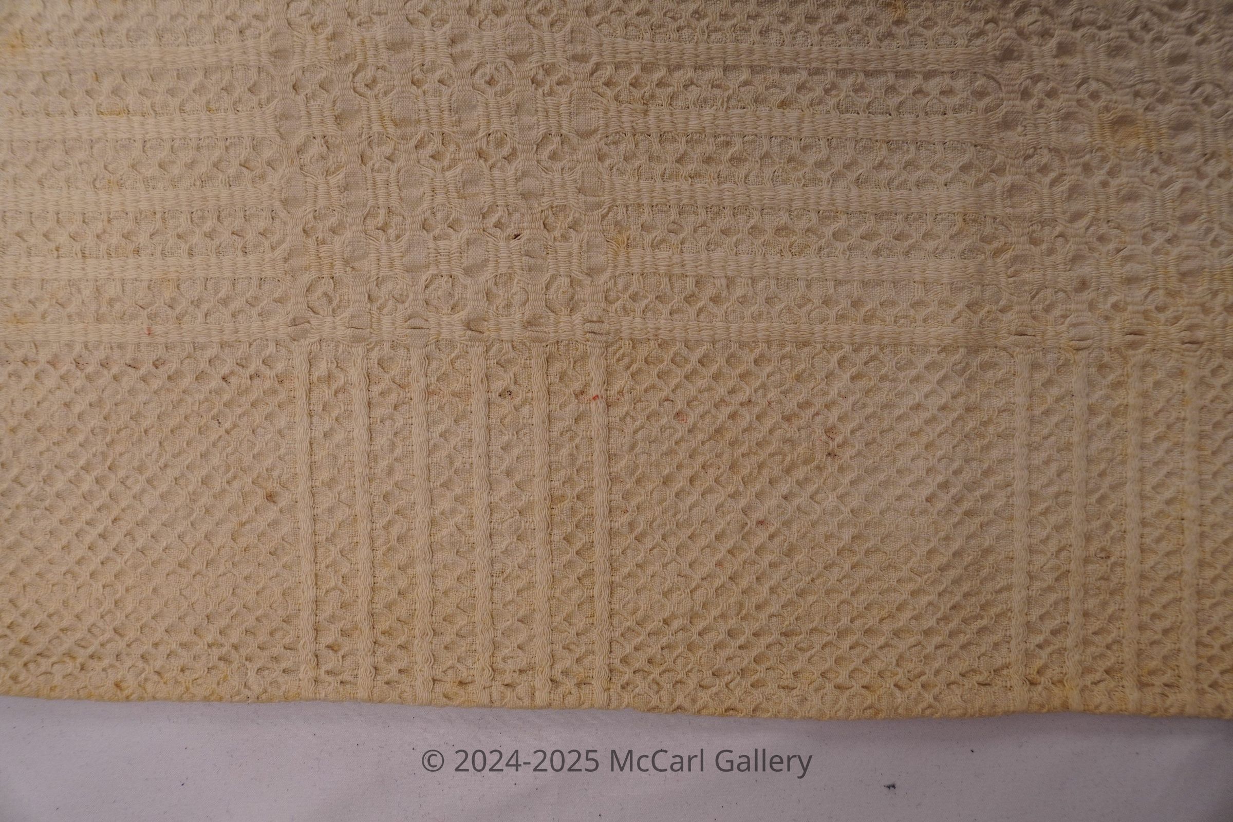 Natural geometric coverlet; three joined panels. No border or fringe.