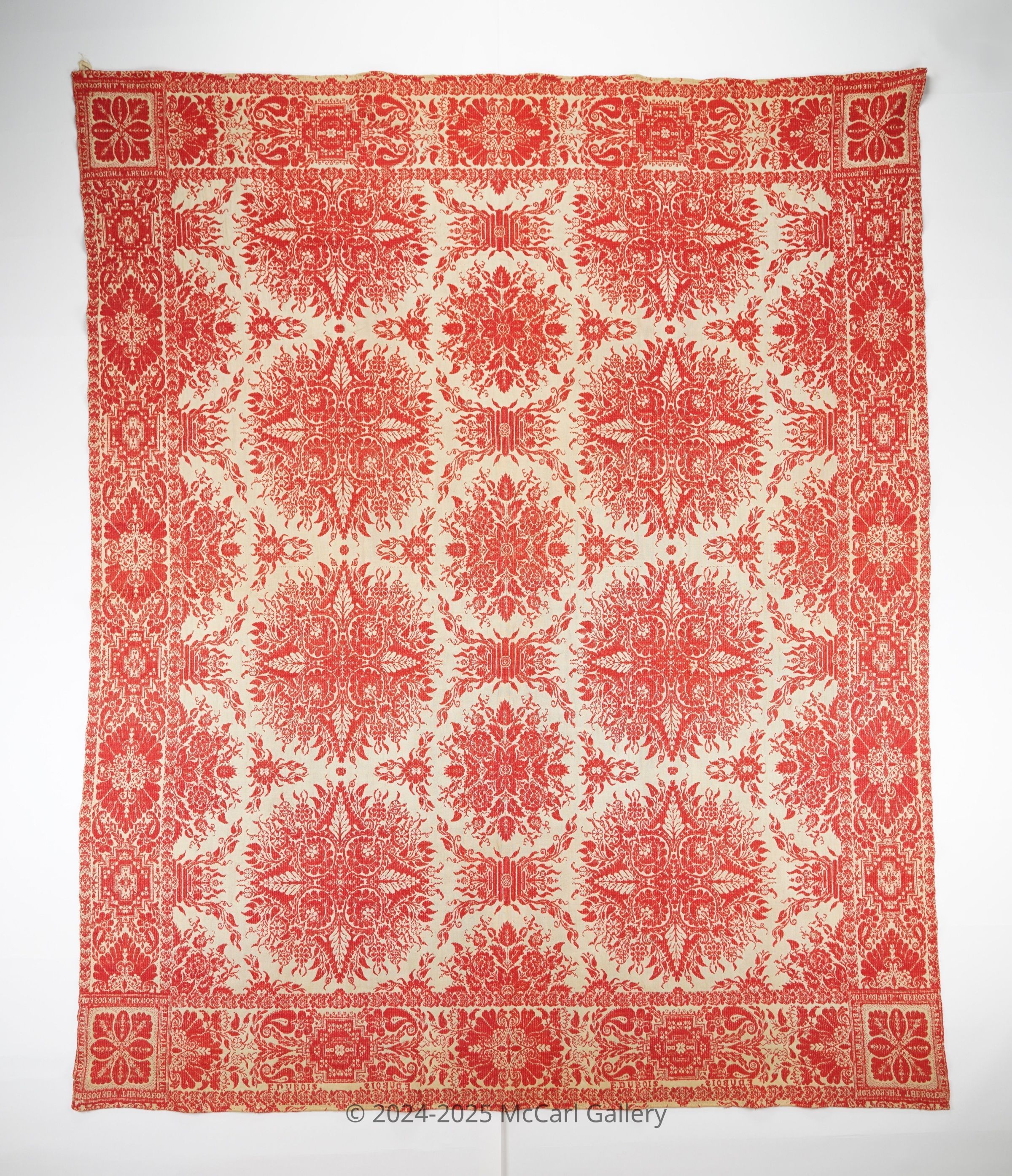 Red and natural figured tied beiderwand coverlet with border and Rose of Allendale trademarks. Attributed to the Conger weavers in New York for E. DuBois.Collection