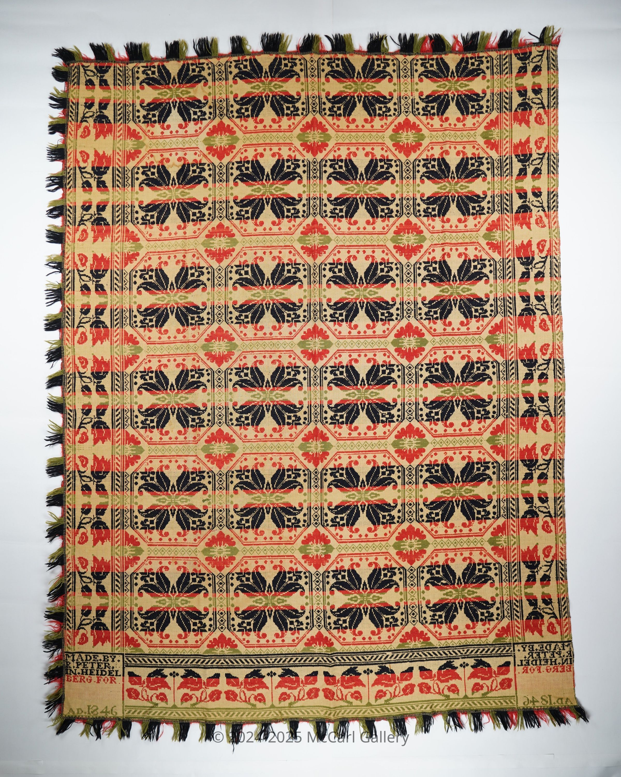 Green, red, navy, and natural figured tied beiderwand coverlet with border and applied fringe on three sides. Woven by Reuben Peter in Heidelberg Twp., Lehigh Co., Pennsylvania in 1846.Collection