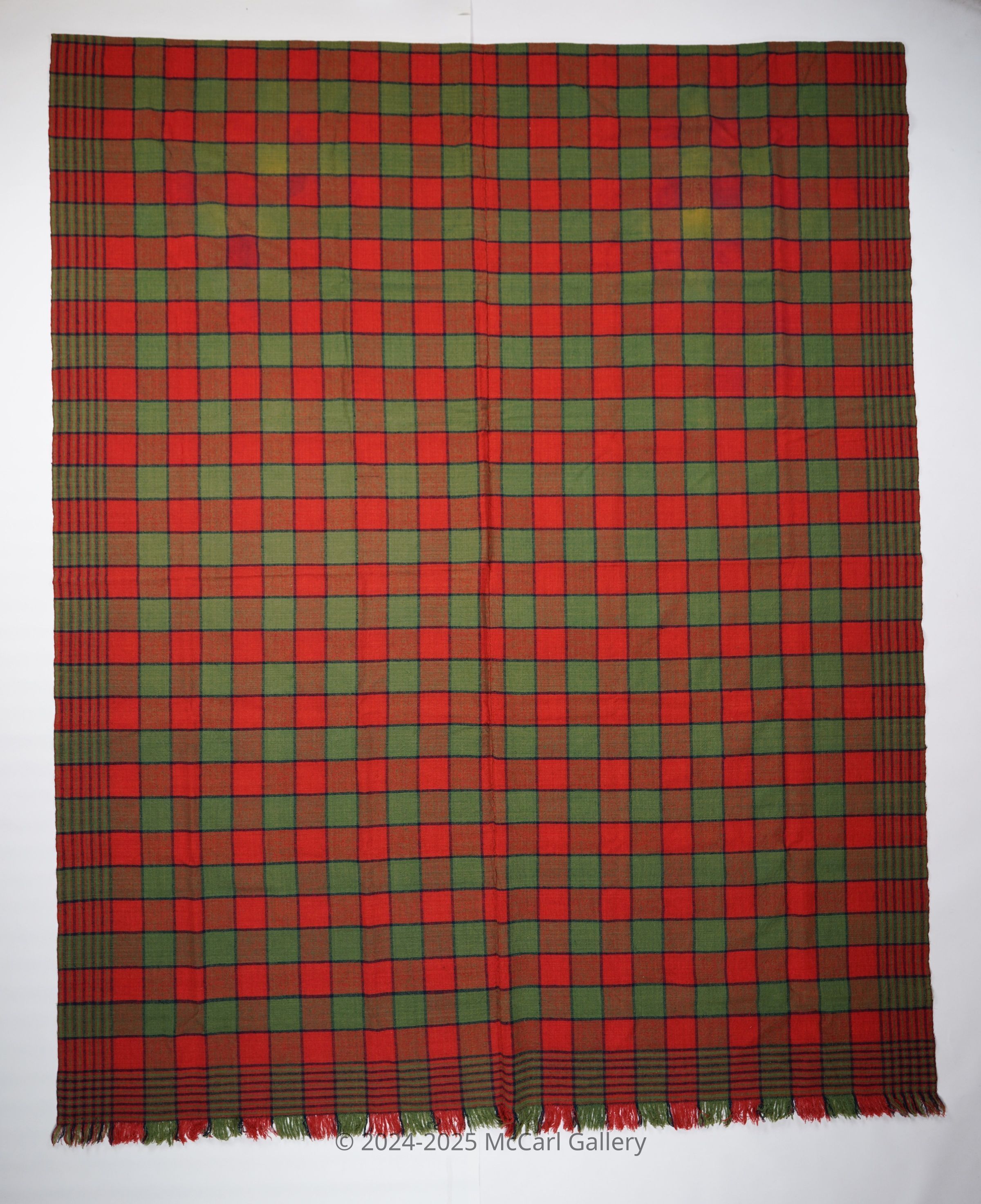 Red, navy, and green geometric plain weave coverlet with border on three sides and self-fringe along bottom. Two joined panels.Collection