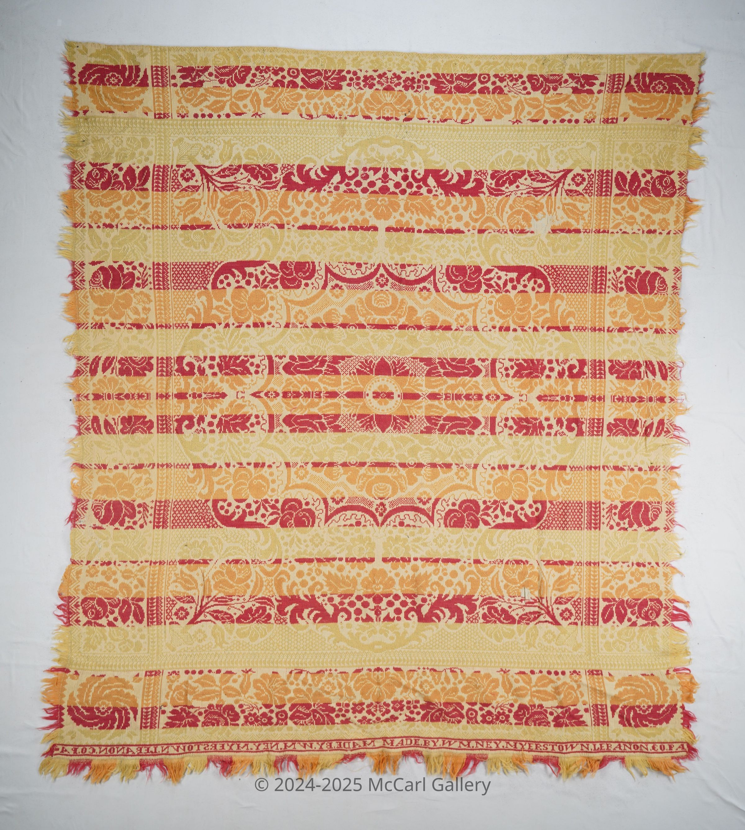 Natural, red, orange, and yellow figured tied beiderwand 3:1 coverlet; seamless. Border on four sides; fringe on three sides.Collection