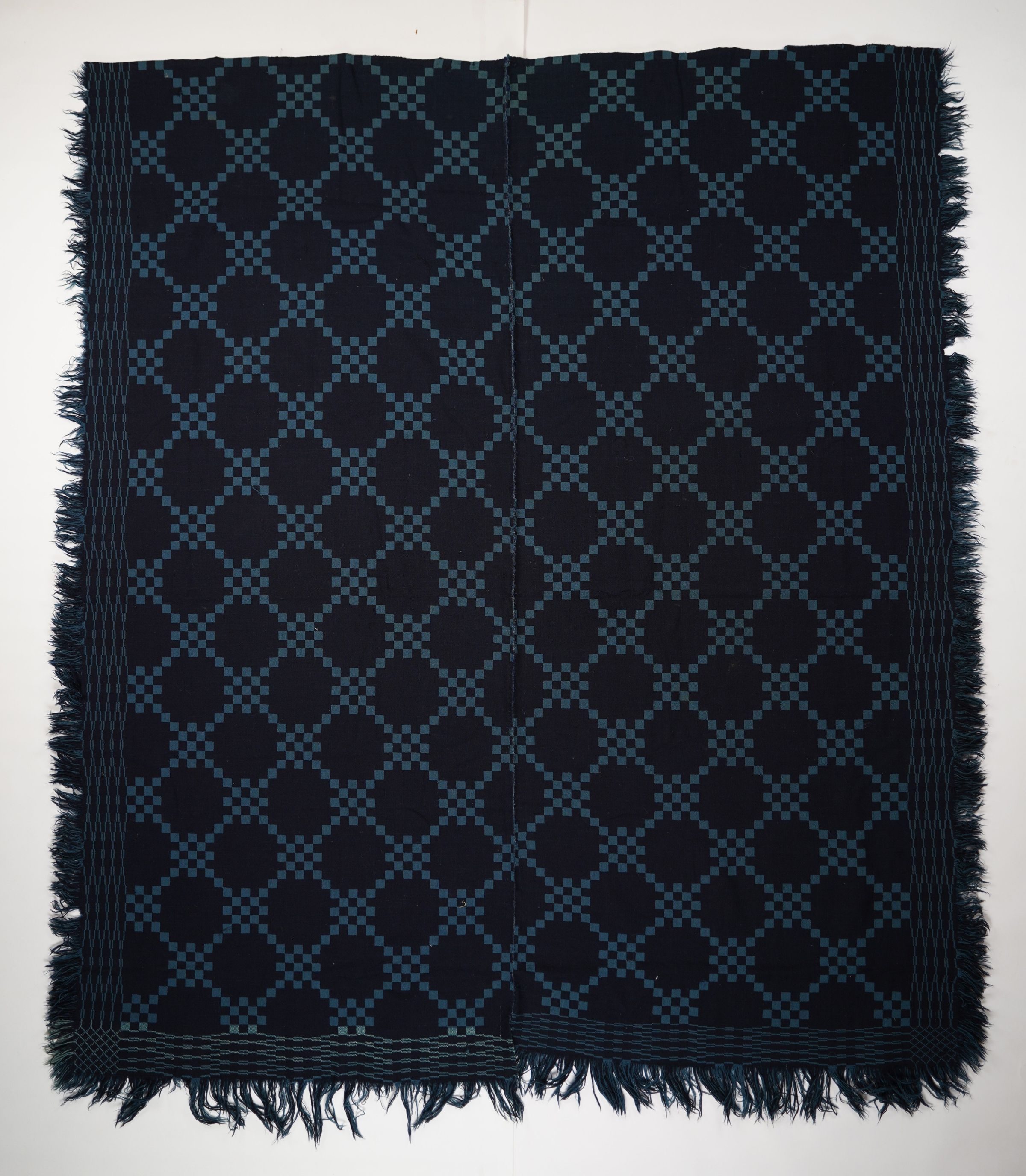 Blue and navy geometric double weave coverlet with border and self-fringe on three sides. Two joined panels.