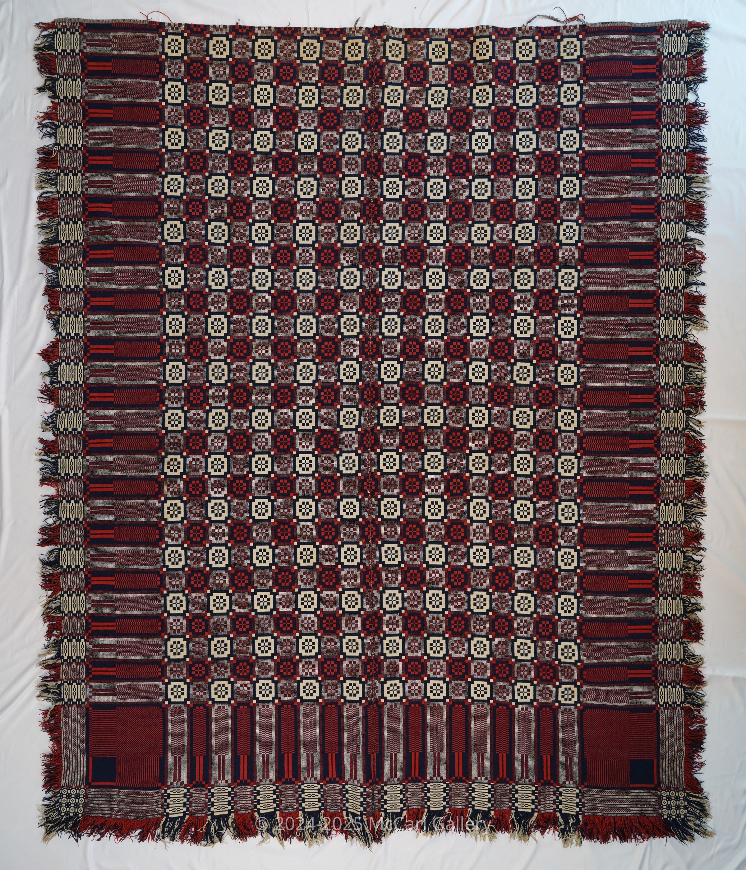 Natural, navy, red, and grey geometric double weave coverlet; two panels joined by a center seam. Border and fringe on three sides.